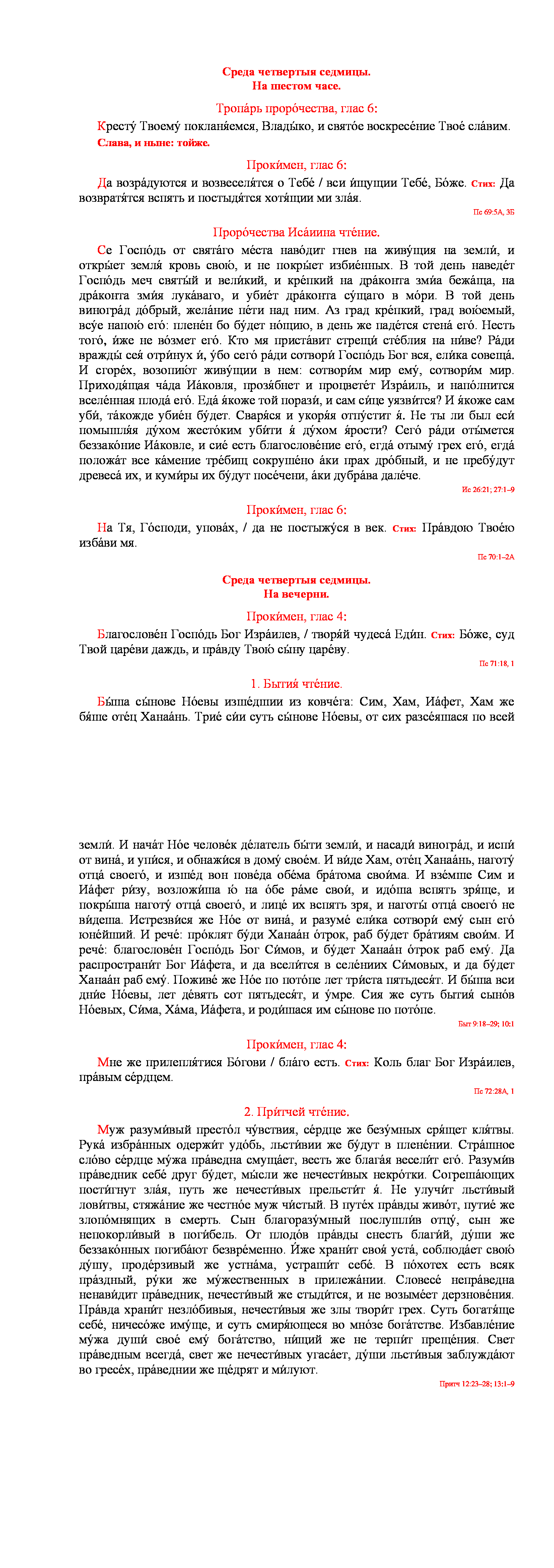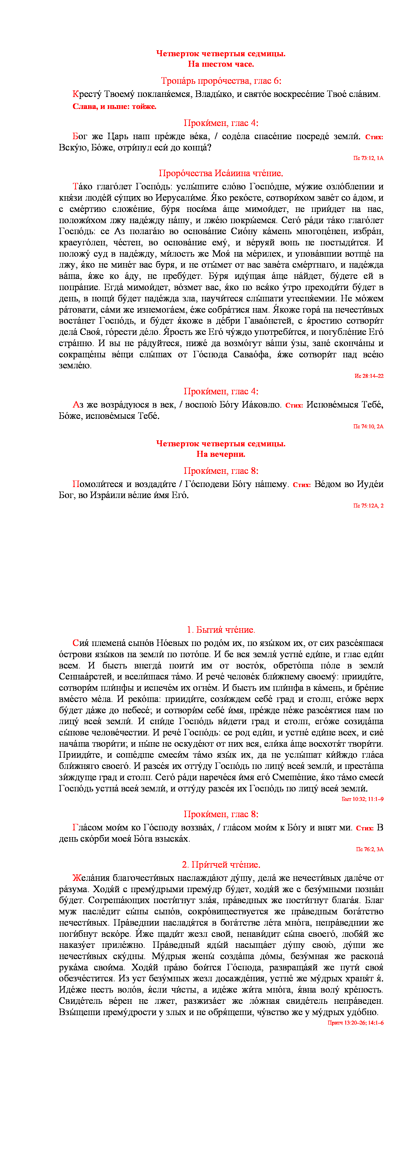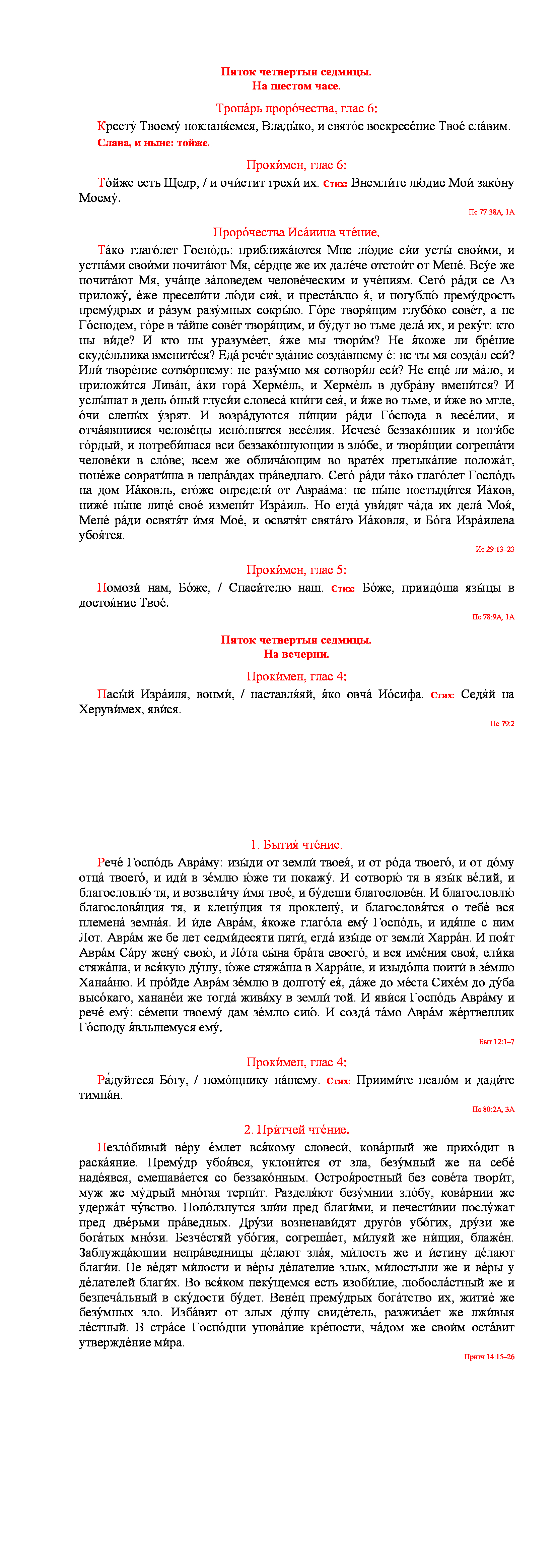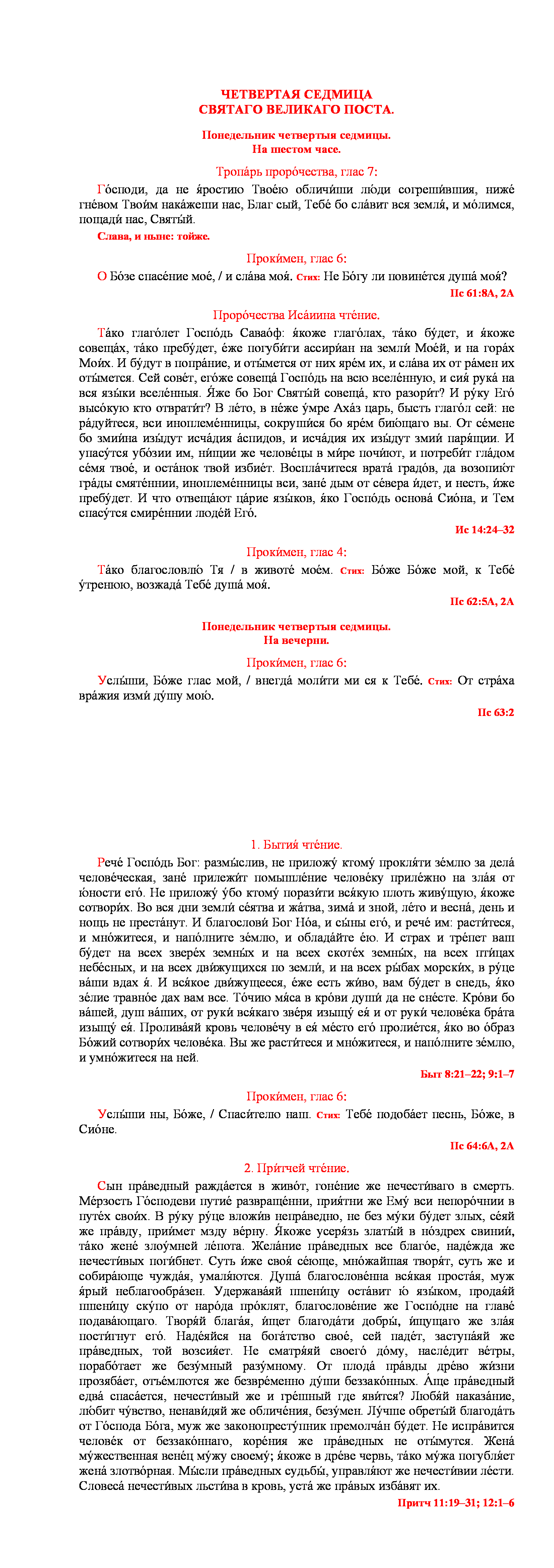 В субботу четвертой седмицы поста Церковь чтением Апостола поучает нас любви и благотворению ближним и быть ревностными в добродетели до конца (Евр. 6:9-12); а чтением Евангелия благовествует об исцелении глухонемого прикосновением и словом к нему Иисуса Христа (Мк. 7:31-51).