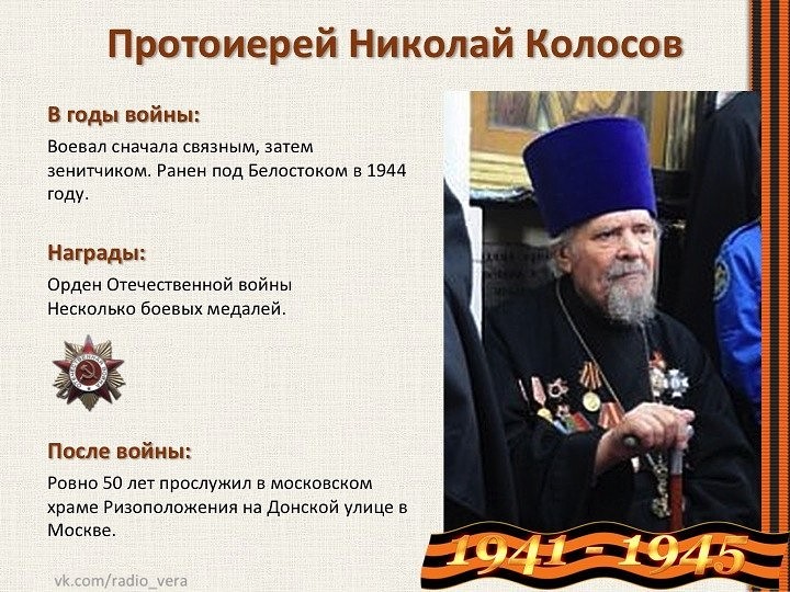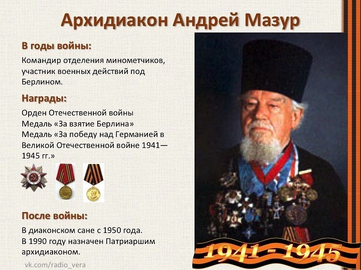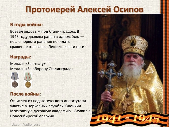 Сегодня мало кто знает о священниках, воевавших на фронтах Великой Отечественной войны. Никто точно не скажет, сколько их было, шедших в бой без рясы и крестов, в солдатской шинели, с винтовкой в руке и молитвой на устах. Статистики никто не вел. Но батюшки не просто сражались, защищая свою веру и Отечество, а еще и получали награды – почти сорок священнослужителей были награждены медалями «За оборону Ленинграда» и «За оборону Москвы», более пятидесяти – «За доблестный труд во время войны», несколько десятков – медалью «Партизану Великой Отечественной войны». А скольких еще награды обходили стороной?