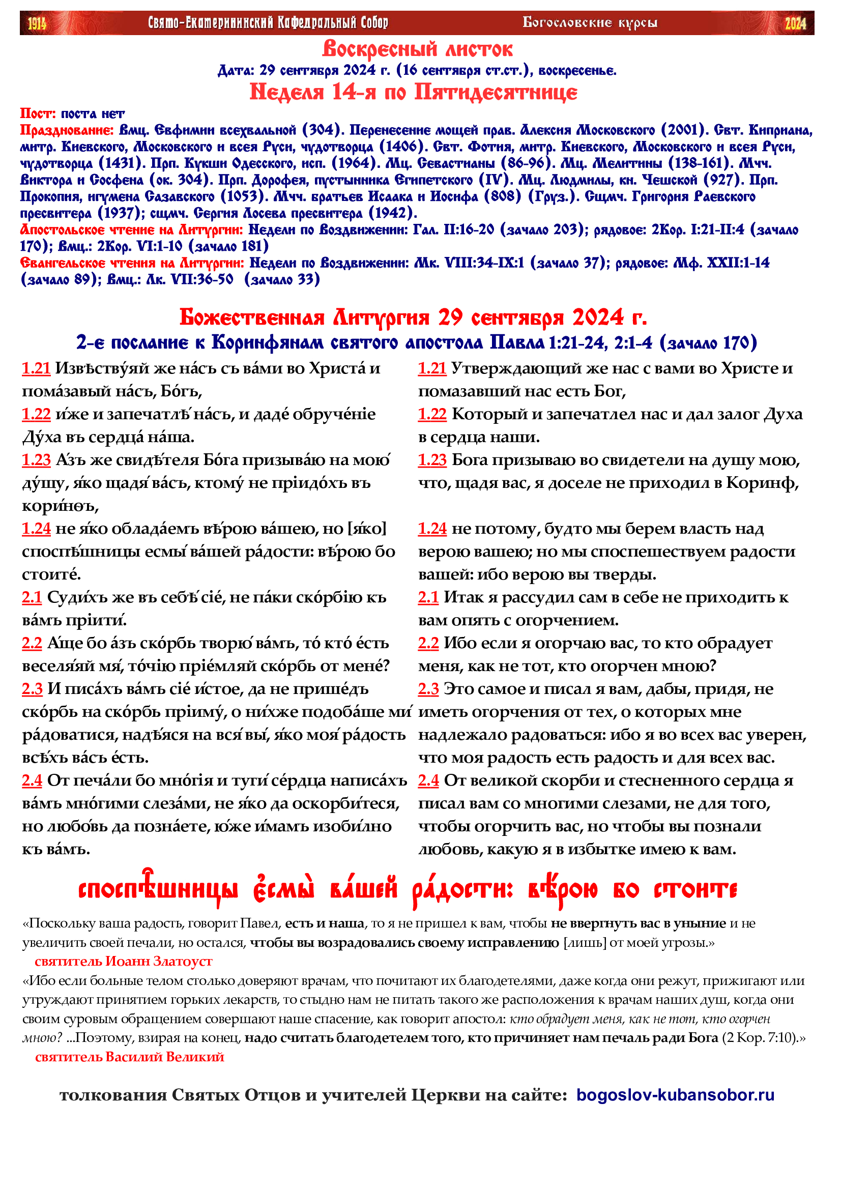 29 сентября 2024 года. Неделя 14-я по Пятидесятнице