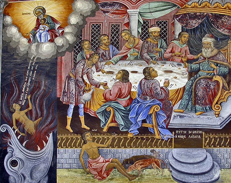 «чадо, помяни, яко восприял еси благая твоя в животе твоем, и Лазарь такожде злая»; почему достойно ныне Лазарь веселится, ты же страждешь.