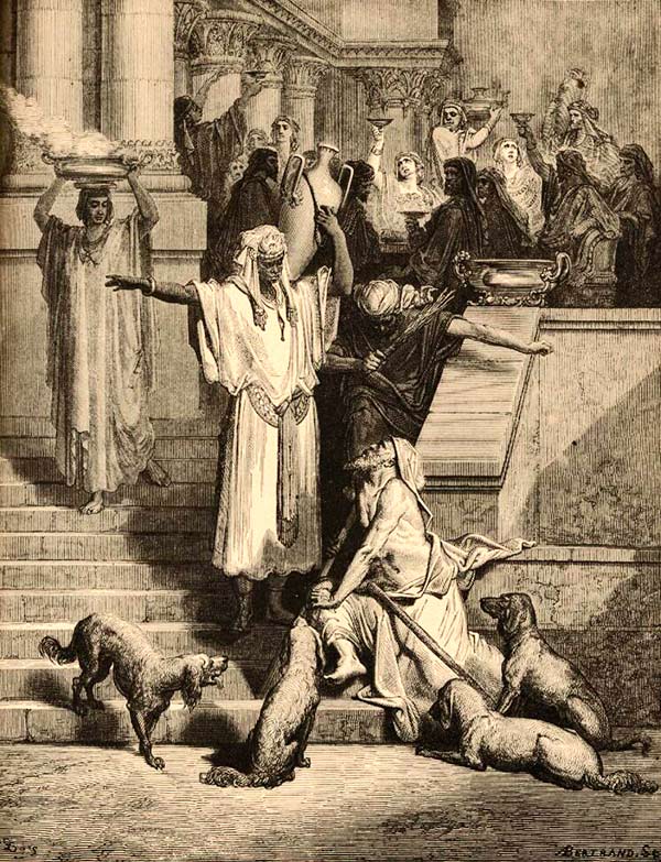 и желал напитаться крошками, падающими со стола богача, и псы, приходя, лизали струпья его (ст.20–21);