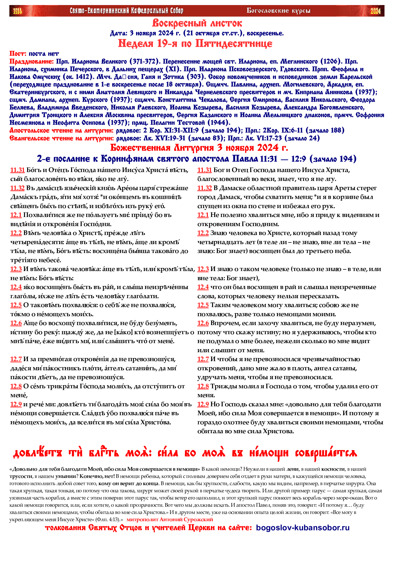 3 ноября 2024 года. Неделя 19-я по Пятидесятнице