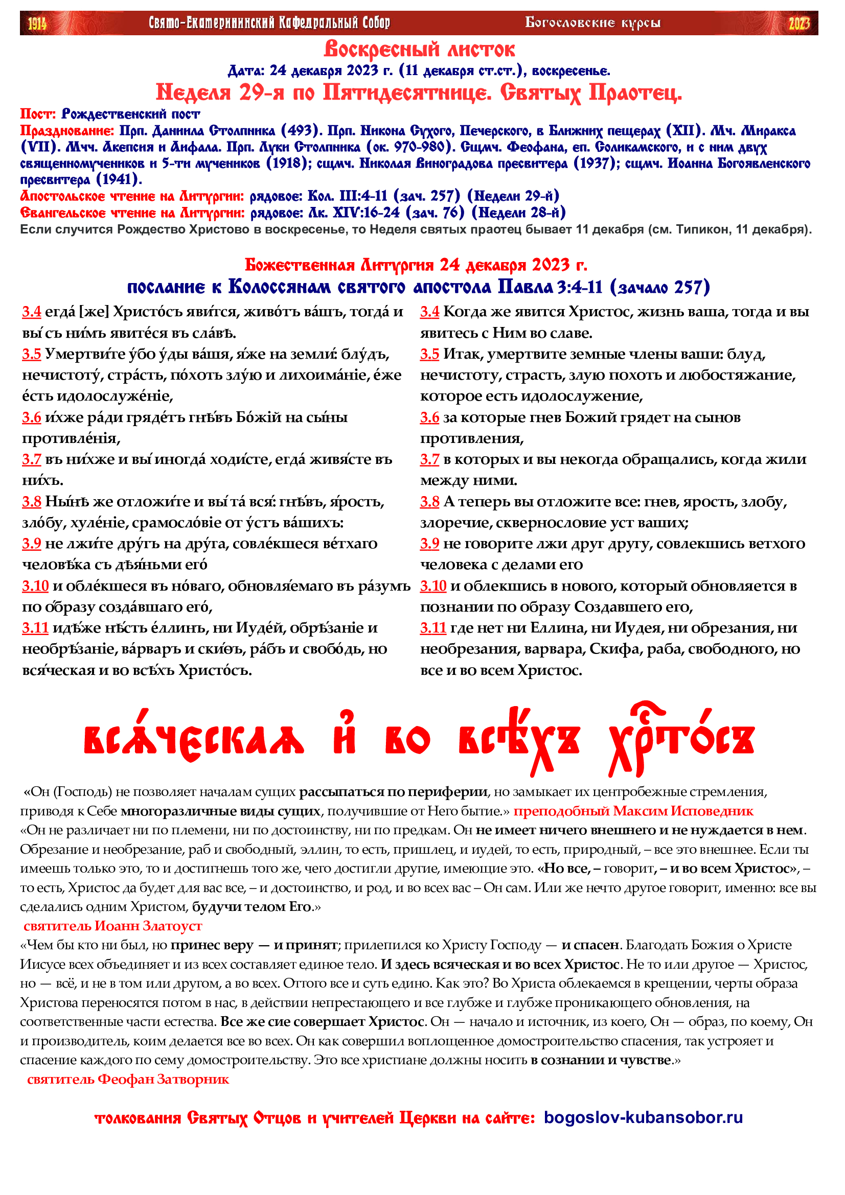 24 декабря 2023 года. Неделя 29-я по Пятидесятнице