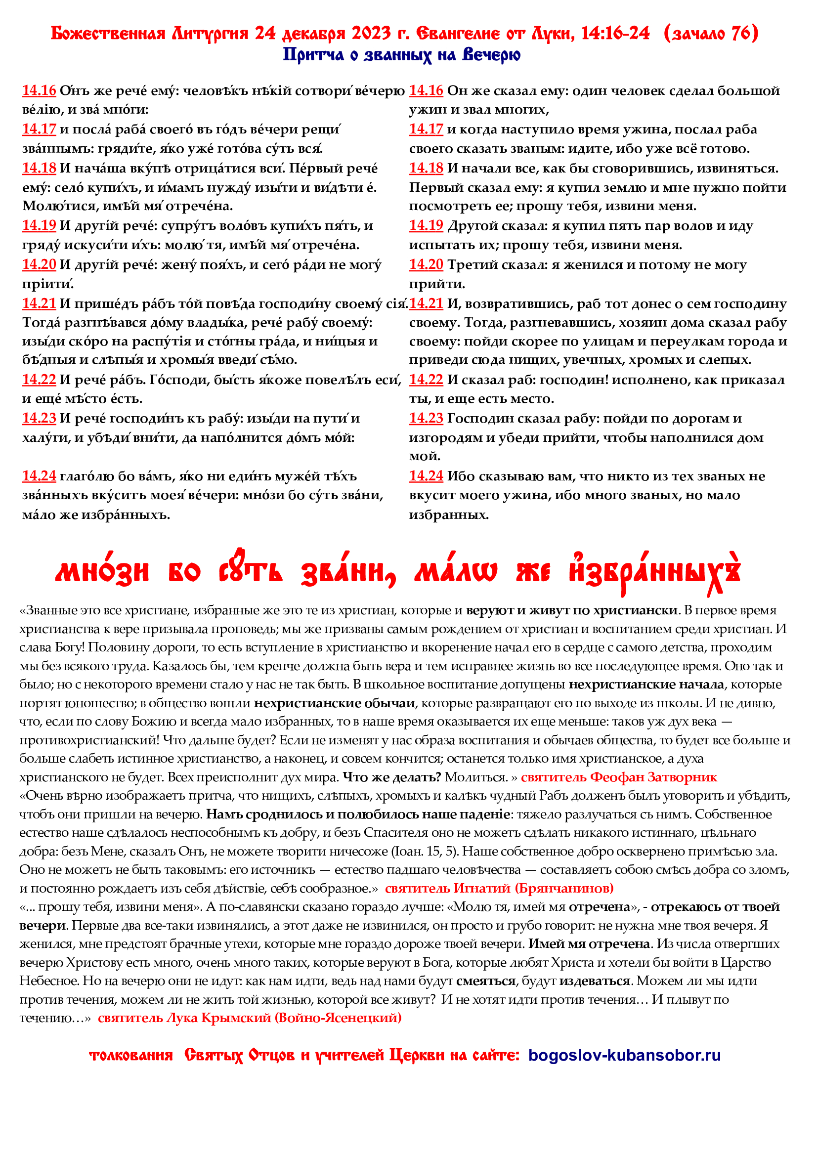 глагóлю бо вáмъ, я́ко ни еди́нъ мужéй тѣ́хъ звáнныхъ вкýситъ моея́ вéчери: мнóзи бо сýть звáни, мáло же избрáнныхъ.Ибо сказываю вам, что никто из тех званых не вкусит моего ужина, ибо много званых, но мало избранных.
