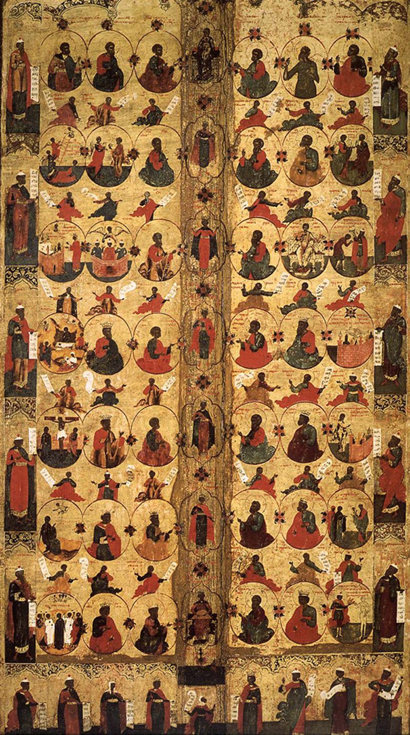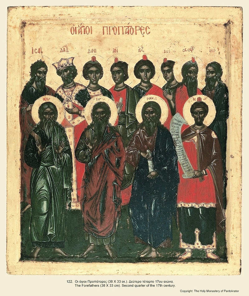 Поэтому, братья, похвалим благого Владыку, прославившего наших духовных отцов. Радуйся, первым сотворенный Адам, ведь Бог не забыл тебя во аде, — вот твой избавитель Спас приходит родиться от Девы, и Бог человеком становится, чтоб обожить человеческую природу. Собрание богоугодных людей от древних веков: