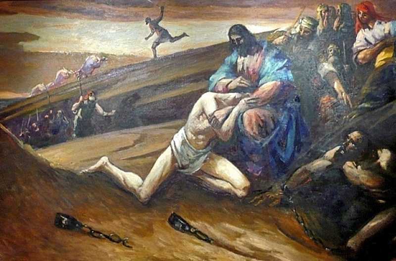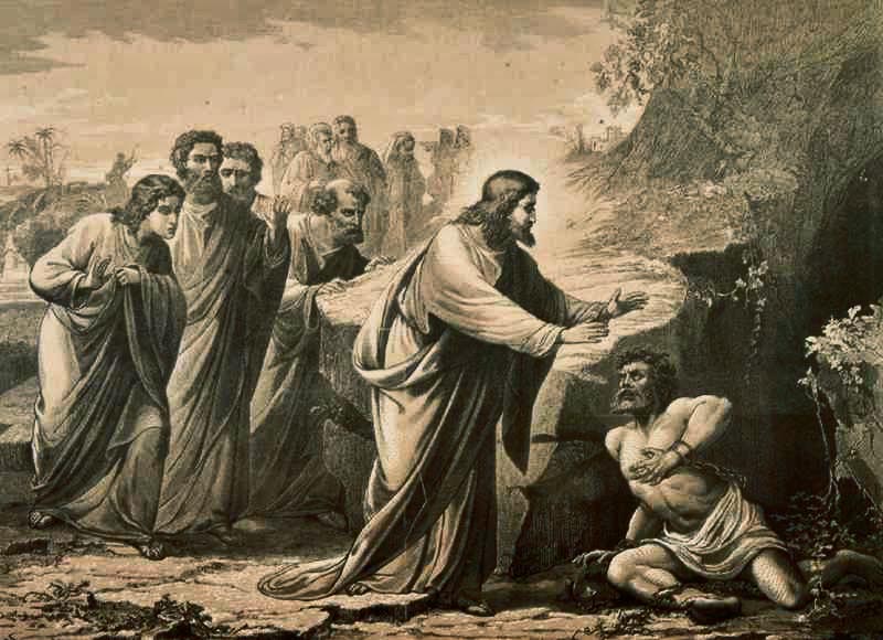Ибо Иисус повелел нечистому духу выйти из сего человека, потому что он долгое время мучил его, так что его связывали цепями и узами, сберегая его; но он разрывал узы и был гоним бесом в пустыни" (ст.27–29)