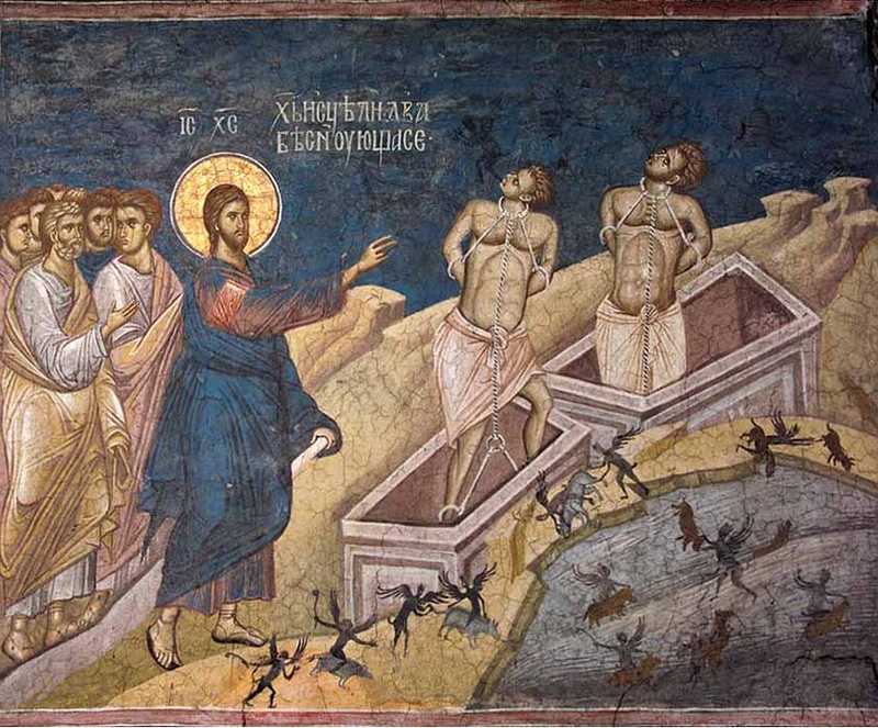 Потому слуги Велиара, мучители людей, и спрашивают Христа, зачем Он пришел к ним? И при этом: прежде времени мучить нас. Значит, они ожидают судного дня и мучений в конце времен. Уже одно присутствие Христа означает для них мучение более страшное, чем свет для крота или огонь для паука. В отсутствие Христа бесы бесстыдны и дерзки настолько, что одержимых ими людей ставят ниже скотов и наполняют страхом всю окрестность, так что никто не смел проходить тем путем. А в присутствии Христа они не только рабски испуганны, но и трусливо покорны – как всякий тиран перед своим судьей – ибо, вот, они стали униженно просить Господа, чтобы Он не посылал их в бездну. И они просили Иисуса, чтобы не повелел им идти в бездну. Чтобы не повелел – потому что, стало быть, если Он повелит им, они вынуждены будут пойти. Такова власть и сила Христова. А бездна есть их истинное жилище и место их мучений. О князе бесовском говорит прозорливый пророк: