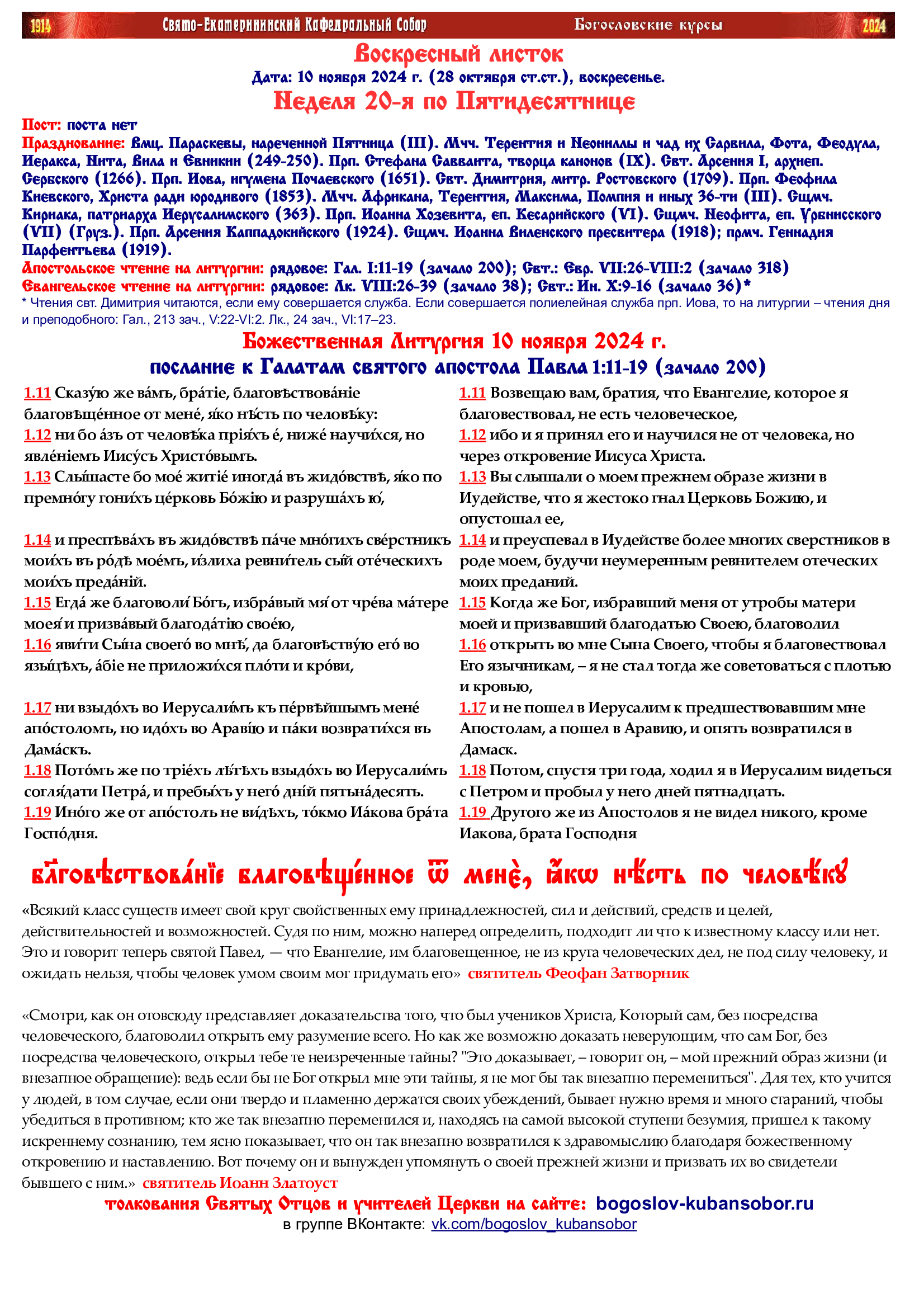 10 ноября 2024 года. Неделя 20-я по Пятидесятнице