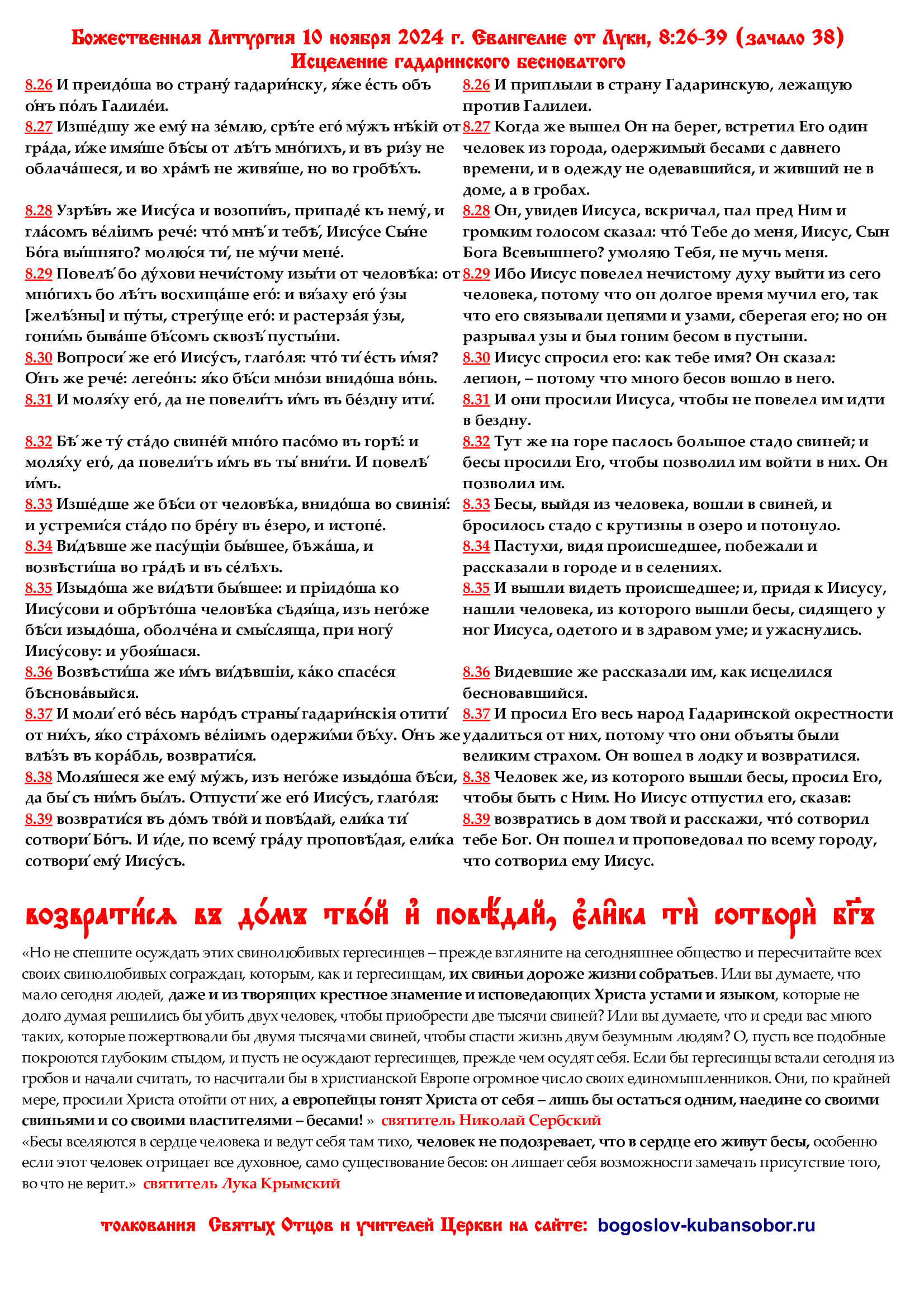 В 2024 году в неделю 20-ю по Пятидесятнице в ходе Божественной Литургии читается рядовое зачало 38 из Евангелия от Луки (Лк. 8:26-39): исцеление гадаринского бесноватого