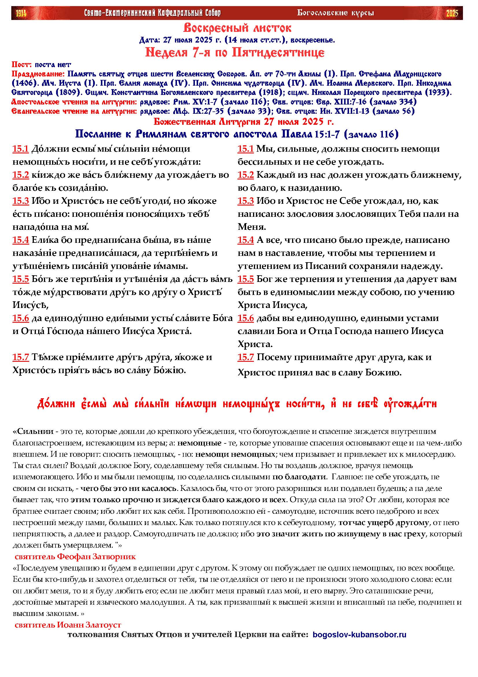 27 июля 2025 года. Неделя 7-я по Пятидесятнице