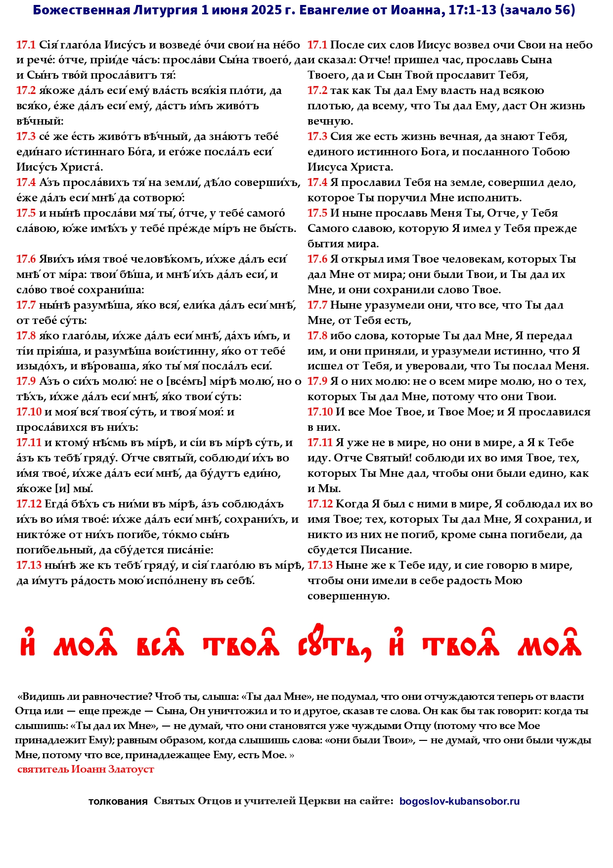 Но эта молитва относится и ко всем нам, крещенным в Церкви Апостольской и узнавшим от апостолов и их последователей о спасительном имени Господа и Спаса нашего Иисуса Христа. О братия мои, подумайте о том, что Господь Иисус Христос две тысячи лет назад пред самой Своею смертью думал о вас и молился о вас Богу! О, да соблюдет и да очистит вас всесильная молитва сия от всякого греха, да исполнит вас радости и да соединит сердца и души ваши! Да будете все едино в прославлении Отца и Сына и Святаго Духа – Троицы Единосущной и Нераздельной, Коей подобает слава ныне и присно, во все времена и во веки веков. Аминь.