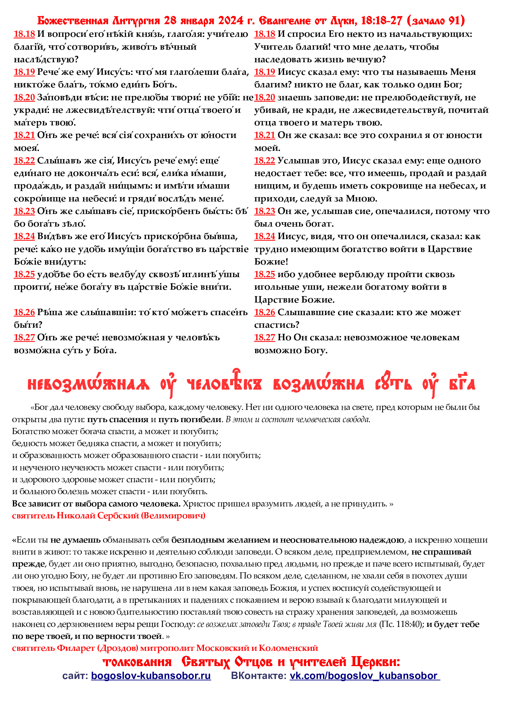 В 2024 году в неделю 34-ю по Пятидесятнице в ходе Божественной литургии читается отрывок из Евангелия от Луки (Лк. 18:18-27). Беседа об опасности от богатства приведена у ев. Луки согласно с ев. Марком (Мк. 10:17-31). Ев. Матфей приводит эту беседу с некоторым пополнением ответа Петру (Мф. 19:16-30). Поэтому мы также размещаем святоотеческие толкования на соответствующие стихи Евангелия от Матфея.
