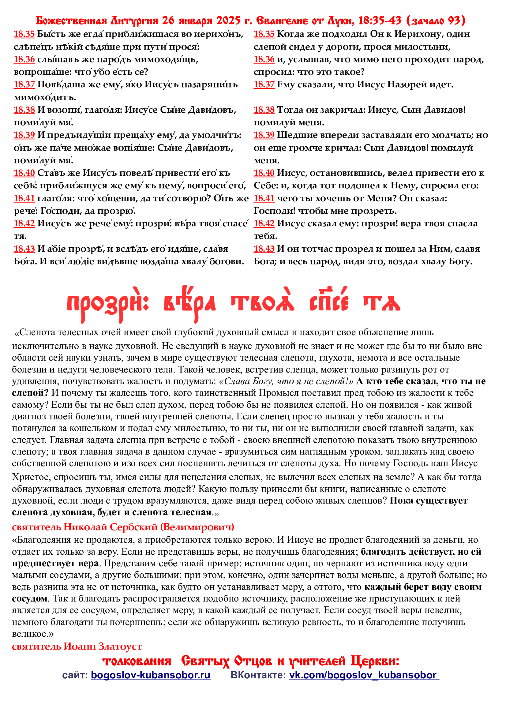 В 2025 году в неделю 31-ю по Пятидесятнице в ходе Божественной литургии читается рядовое зачало 93 Евангелия от Луки (Лк. 18:35-43) - об исцелении слепого Вартимея.
