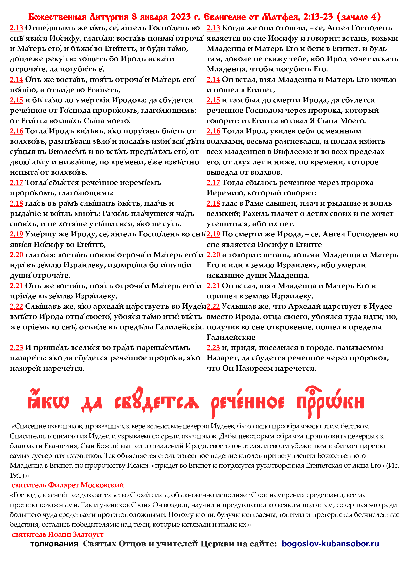Отше́дшымъ же и́мъ, се́, а́нгелъ Госпо́день во снѣ́ яви́ся Ио́сифу, глаго́ля: воста́въ поими́ отроча́ и Ма́терь его́, и бѣжи́ во Еги́петъ, и бу́ди та́мо, до́ндеже реку́ ти: хо́щетъ бо И́родъ иска́ти отроча́те, да погуби́тъ е́.Tше1дшымъ же и5мъ, се2, ѓгг7лъ гDень во снЁ kви1сz їHсифу, глаго1лz: востaвъ поими2 nтрочA и3 м™рь є3гw2, и3 бэжи2 во є3гv1петъ, и3 бyди тaмw, до1ндеже рекy ти: хо1щетъ бо и4рwдъ и3скaти nтрочaте, да погуби1тъ є5.