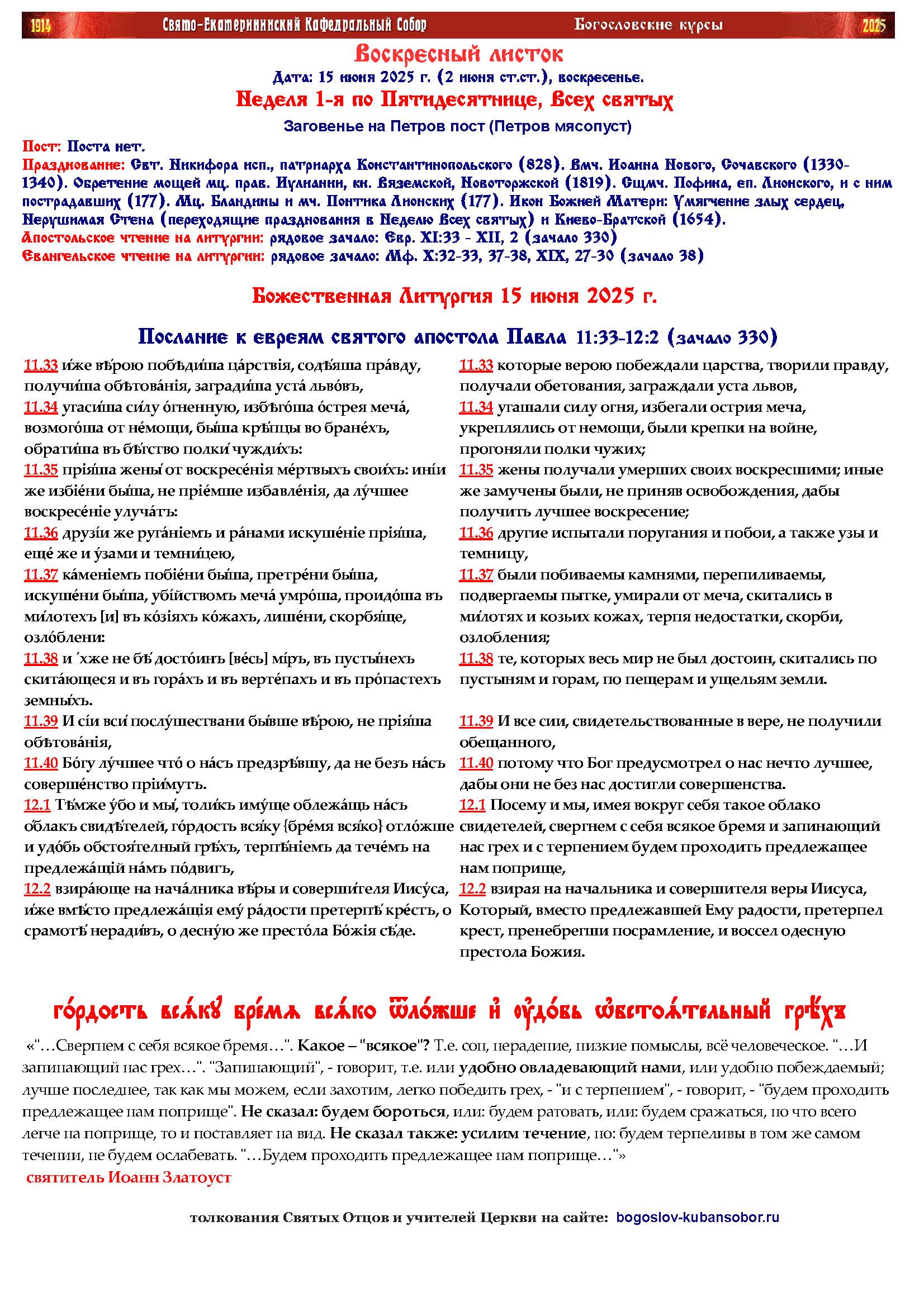 15 июня 2025 года. Неделя 1-я по Пятидесятнице, Всех Святых