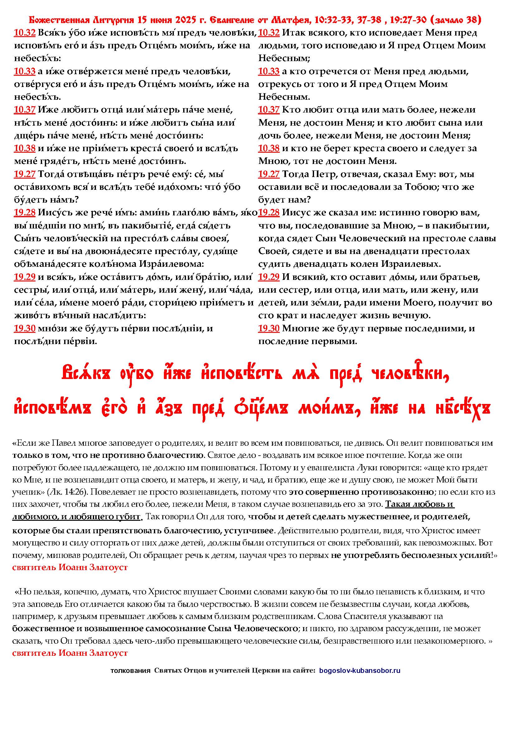 Братия и сестры, важнейшим моментом в ходе Божественной Литургии является чтение Евангелия. Чтобы помочь Вам подготовится к воскресной литургии, мы за несколько дней до службы публикуем тексты евангельских чтений с толкованиями Святых Отцов и учителей православной Церкви. Тексты будут размещены в синодальном переводе и на церковнославянском языке (исходный текст и транслитерация).