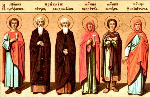 РПЦ в этот день чествует: мц. Перпетуи, мчч. Сатира (Сатура), Ревоката, Саторнила (Сатурнила), Секунда и мц. Фелицитаты (202–203) В правление императора Септимия Севера все они были брошены в темницу как христиане. Святая Перпетуя была благородного происхождения, она ободряла всех прочих узников в темнице, чтобы не устрашились они пострадать за Христа. Во сне Перпетуя узрела лестницу от земли до неба, всю покрытую острыми ножами, мечами, копьями, крючками, гвоздями и другими смертоносными орудиями. А у подножья лестницы лежала страшная змея. И увидела она, что Сатир первым взбежал до вершины лестницы невредимым и крикнул ей оттуда: