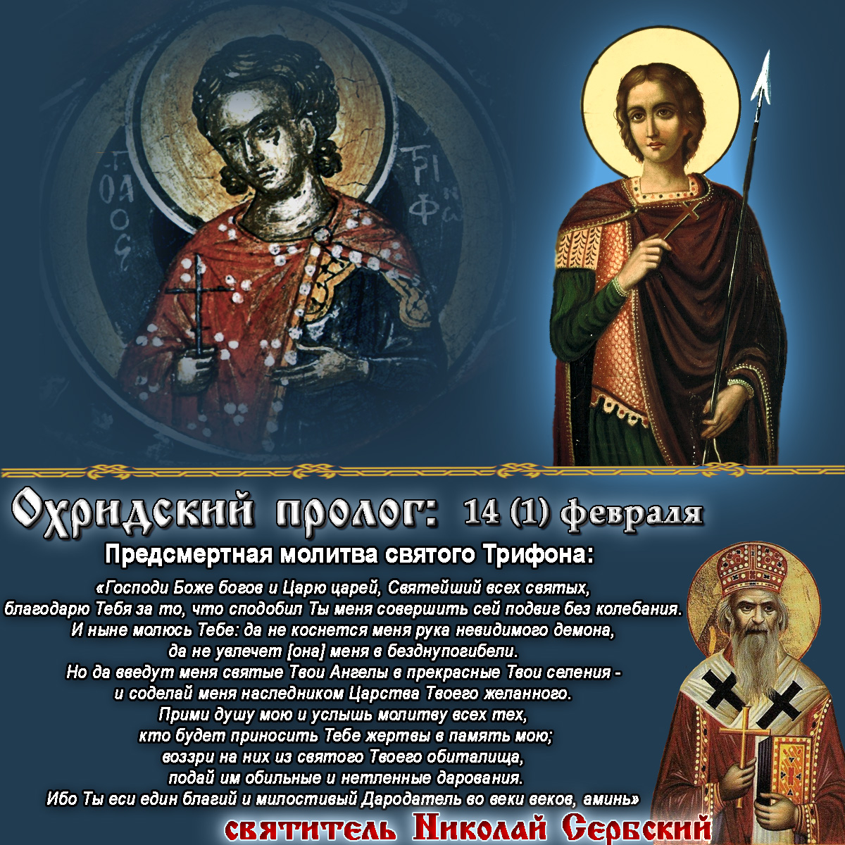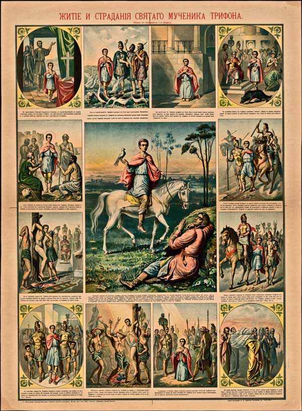 Все пытки не причинили ему никакого вреда, и, в конце концов, мучители осудили его на усечение мечом. Перед смертью святой Трифон помолился Богу и предал душу своему Творцу. Было это в 250 году.