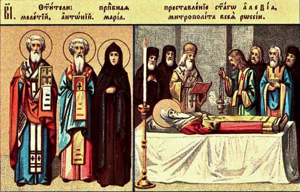 В 19-летнем возрасте он принял иночество и со временем стал митрополитом Московским. Два раза ходил в татарскую Золотую орду: в первый раз — по приглашению хана Джанибека, чтобы исцелить его жену от слепоты, а во второй — чтобы успокоить гнев хана Бердибека на русский народ. Три года ханская супруга была слепой, но выздоровела и прозрела, когда Алексий прочил над ней молитву и помазал ее освященной водой. После трудной и многоплодной жизни упокоился в 1378 году, на 85-м году своей жизни, и переселился во дворы Господни.