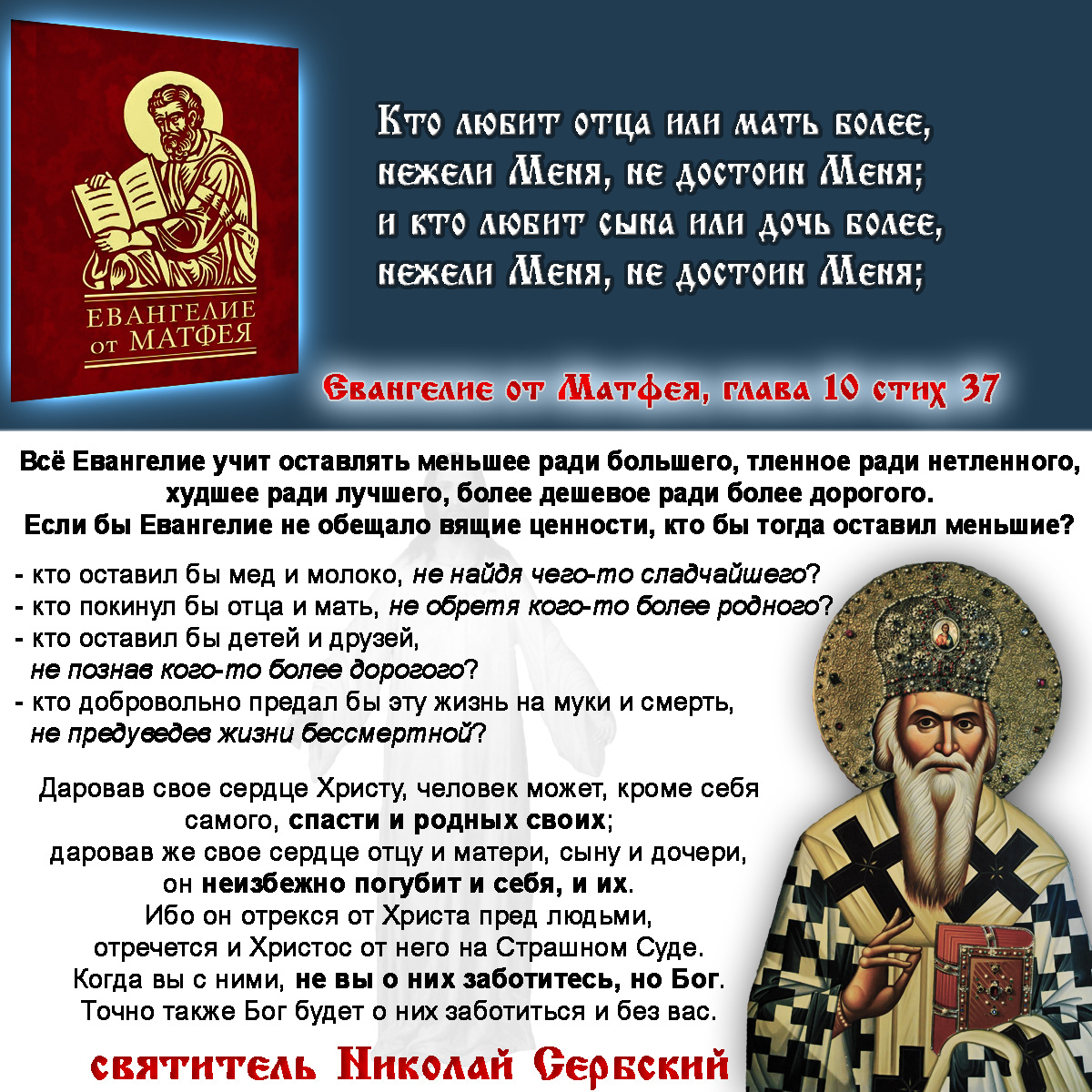 "Кто любит отца или мать более, нежели Меня, не достоин Меня; и кто любит сына или дочь более, нежели Меня, не достоин Меня;"