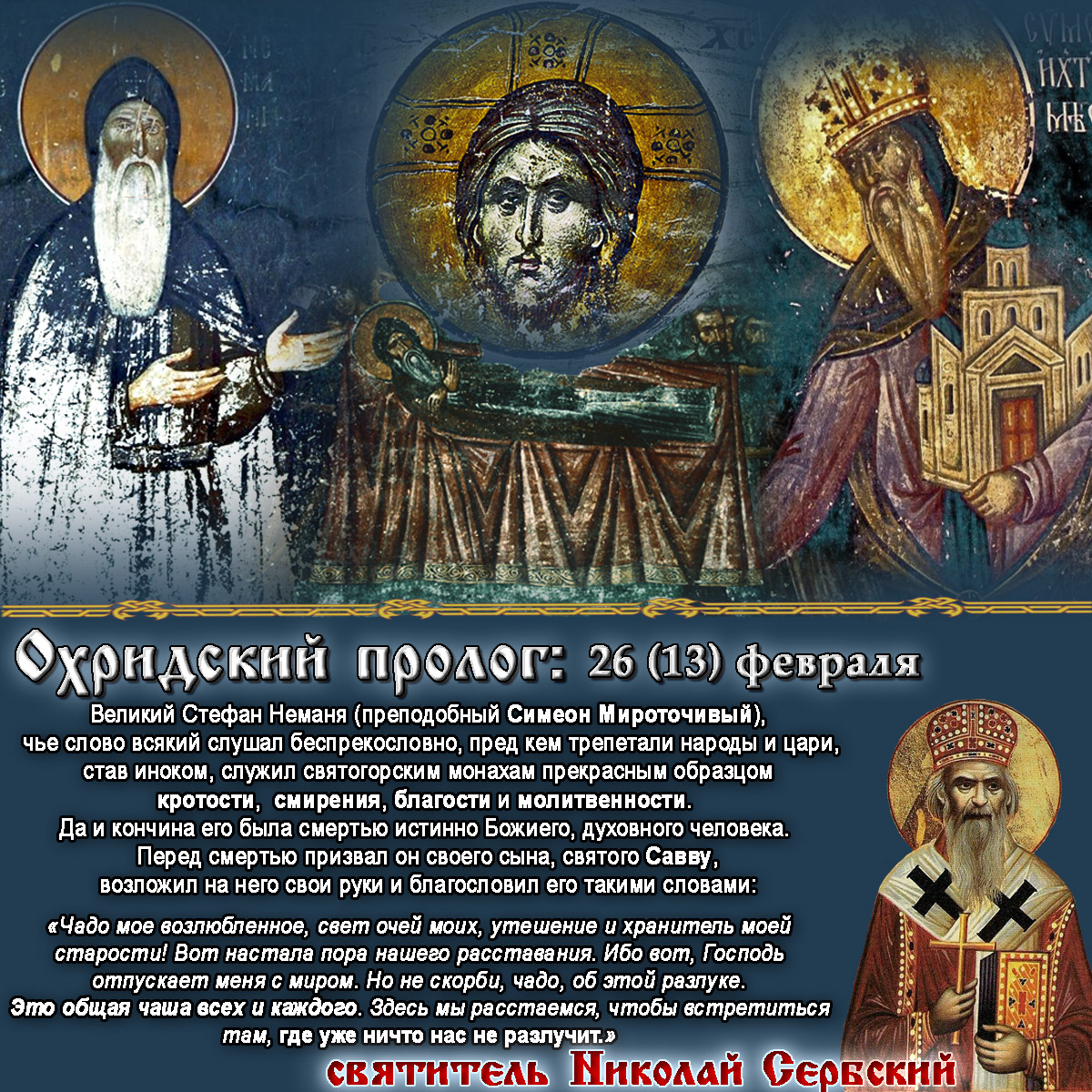Великий Стефан Неманя, чье владычественное слово всякий слушал беспрекословно, пред кем трепетали народы и цари, став иноком, служил святогорским монахам прекрасным образцом кротости, смирения, благости и молитвенности. Да и кончина его была смертью истинно Божиего, духовного человека. Слег он в постель 7 февраля. Призвал к себе святого Савву, возложил на него свои руки и благословил его такими словами:
