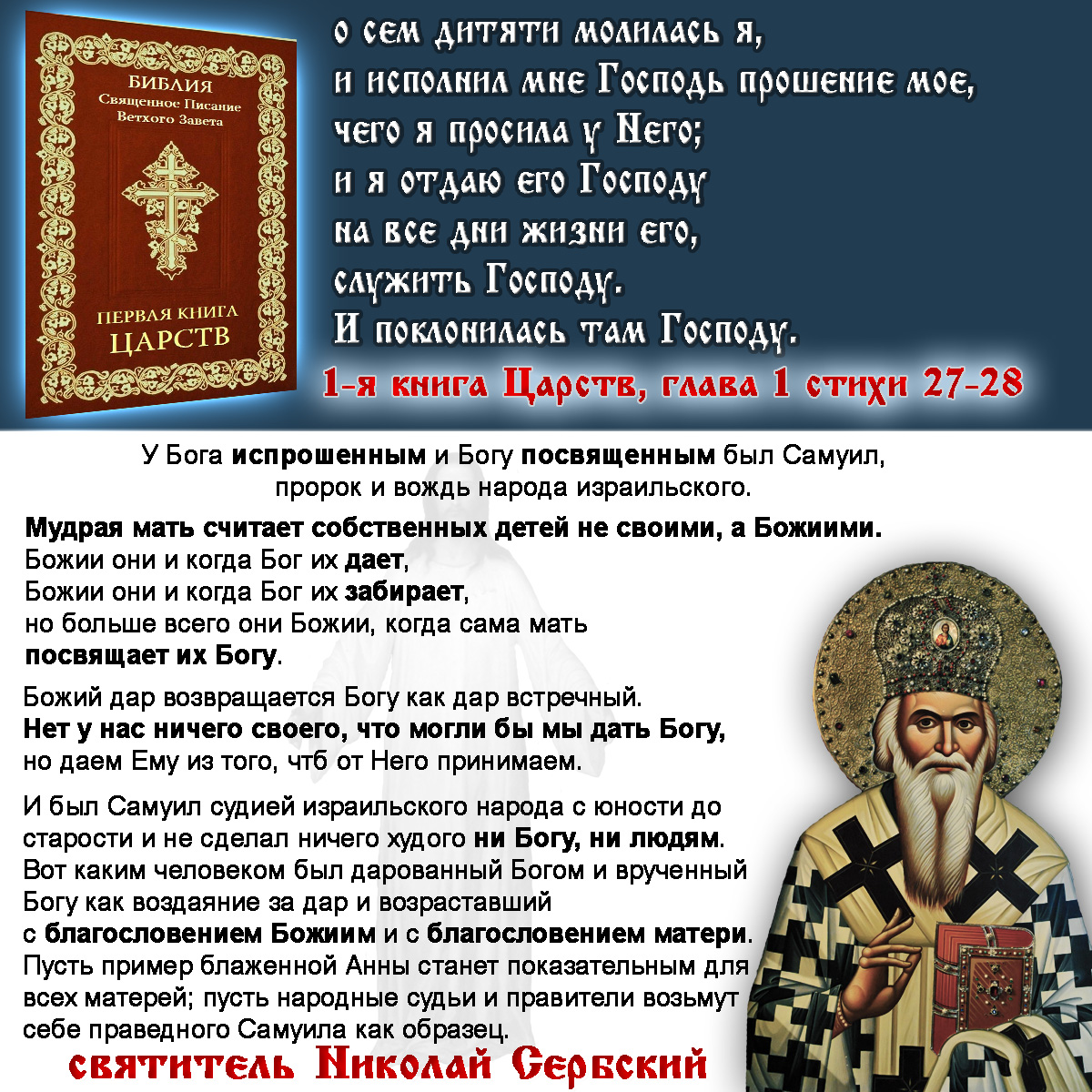 У Бога испрошенным и Богу посвященным был Самуил, пророк и вождь народа израильского. Блаженная Анна, его бездетная мать, слезами и жертвами испросила его у Бога. И его, единственного сына, свое величайшее сокровище, вручила она с самого детства на служение Господу.
