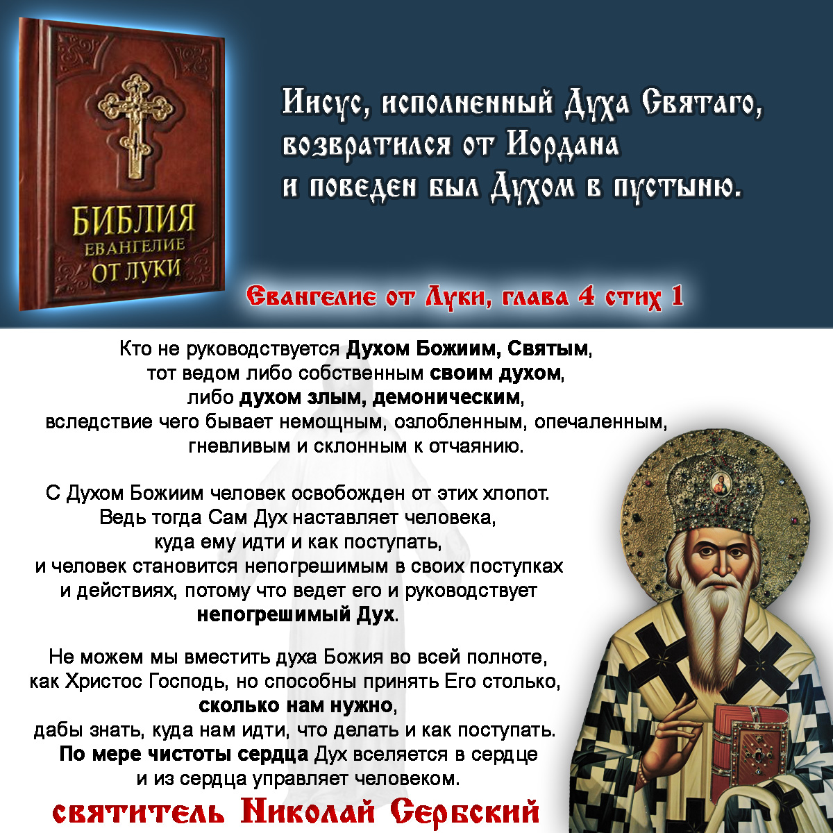 Кто не руководствуется Духом Божиим, Святым, тот ведом либо собственным своим духом, либо духом злым, демоническим, вследствие чего бывает немощным, озлобленным, опечаленным, гневливым и склонным к отчаянию. Не можем мы вместить [в серб. букв:, подъять. — Ред.] Духа Божия во всей полноте, как Христос Господь, но способны принять Его столько, сколько нам нужно, дабы знать, куда нам идти, что делать и как поступать. По мере чистоты сердца Дух вселяется в сердце и из сердца управляет человеком.