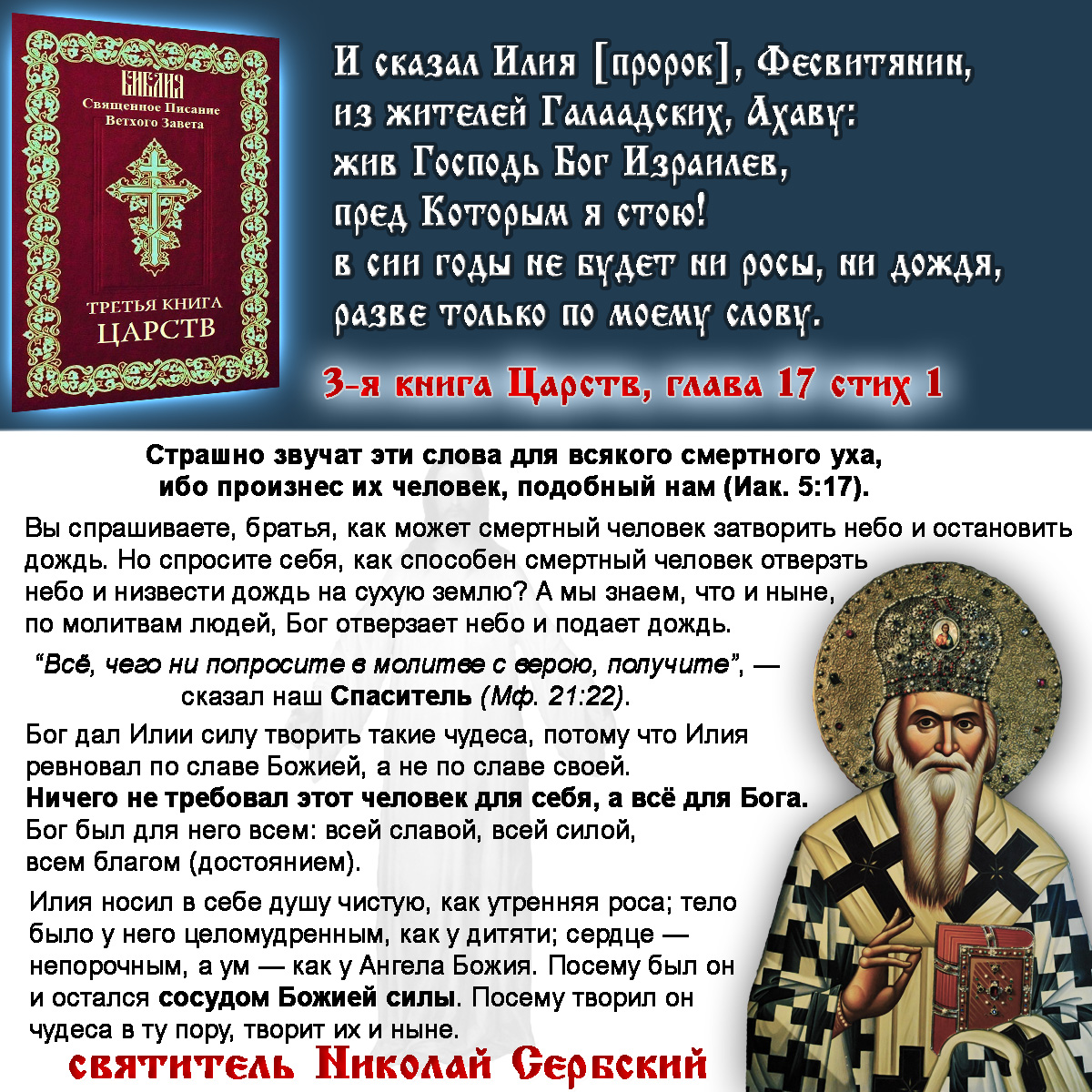 "И рече́ илiа́ проро́къ Ѳесви́тянинъ, и́же от Ѳесві́и Галаа́дскiя, ко Ахаа́ву: жи́въ Госпо́дь Бо́гъ си́лъ, Бо́гъ Изра́илевъ, ему́же предстою́ предъ ни́мъ, а́ще бу́детъ въ лѣ́та сiя́ роса́ и до́ждь, то́чiю от у́стъ словесе́ моего́."