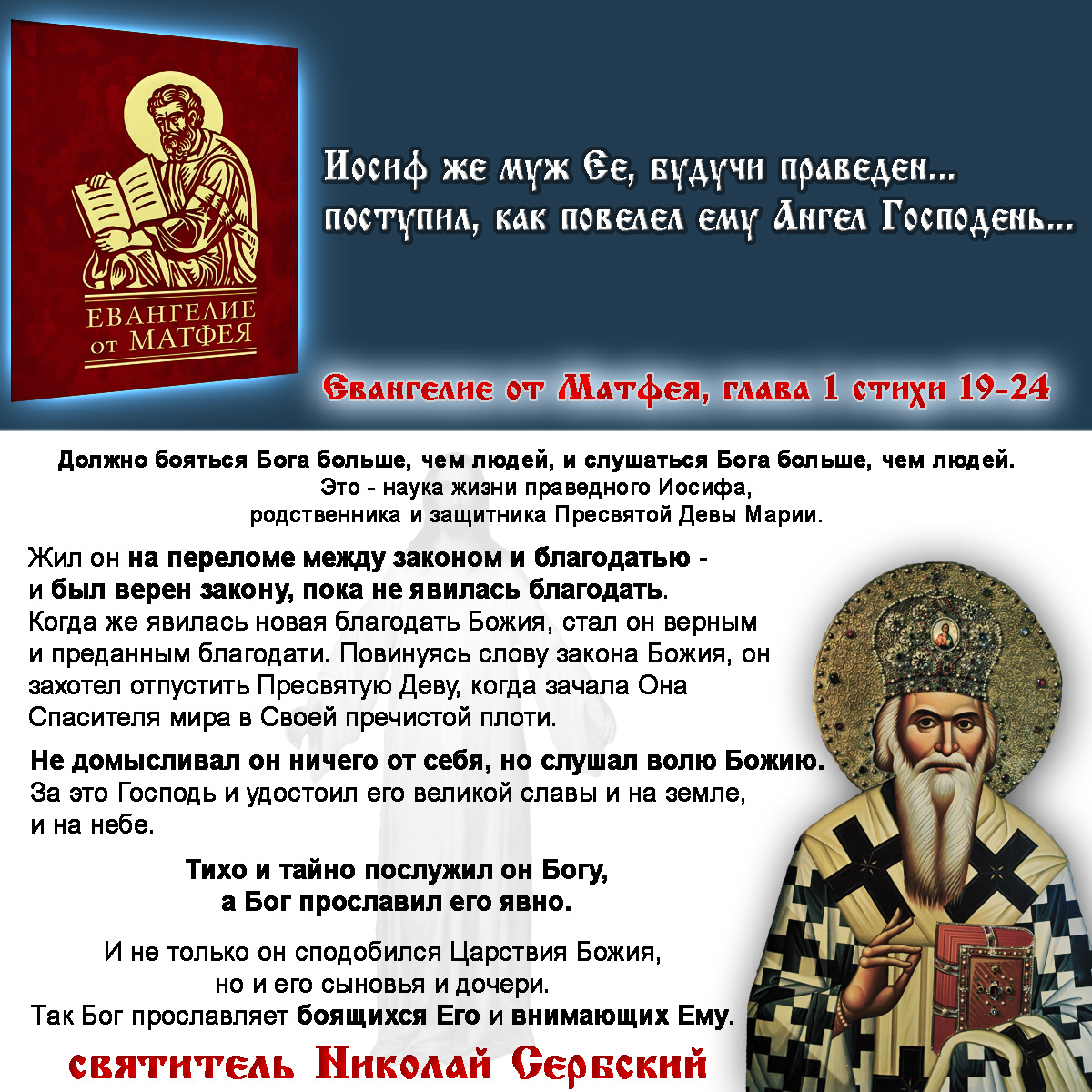 "Ио́сифъ же му́жъ ея́, пра́веденъ сы́й... сотвори́ я́коже повелѣ́ ему́ а́нгелъ Госпо́день..."