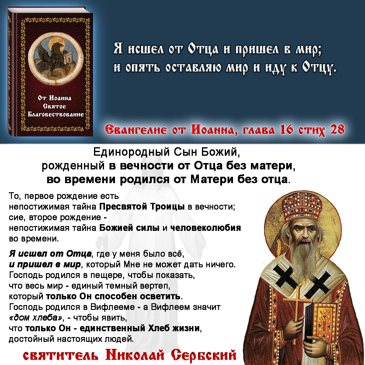 Величайшая тайна во времени соответствует величайшей тайне в вечности. Не вступая с малой свечой нашего разума в эту величайшую тайну, удовлетворимся, братья, сознанием того, что наше спасение проистекло не от человека и не от земли, а [пришло] с превыспренних высот Божественного, невидимого мира. Столь грандиозна милость Божия и столь велико достоинство человека, что Сам Бог Сын ниспустился из вечности во время, с неба на землю, с престола славы в овчий вертеп — только чтобы спасти людей, и очистить их от греха, и возвратить в рай.