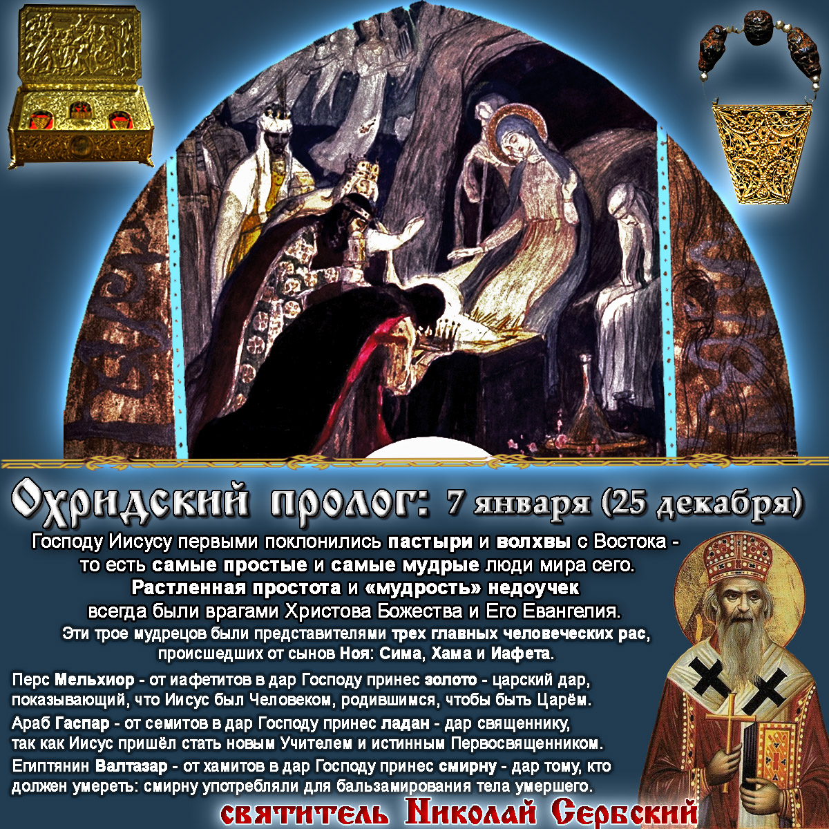 В ту пору прибыли и три мудреца [волхва] с Востока, предводимые удивительной звездой, и принесли свои дары: золото, ладан и смирну. Поклонились они Младенцу как Царю царей и вручили Ему свои дары (Мф. 2:11).