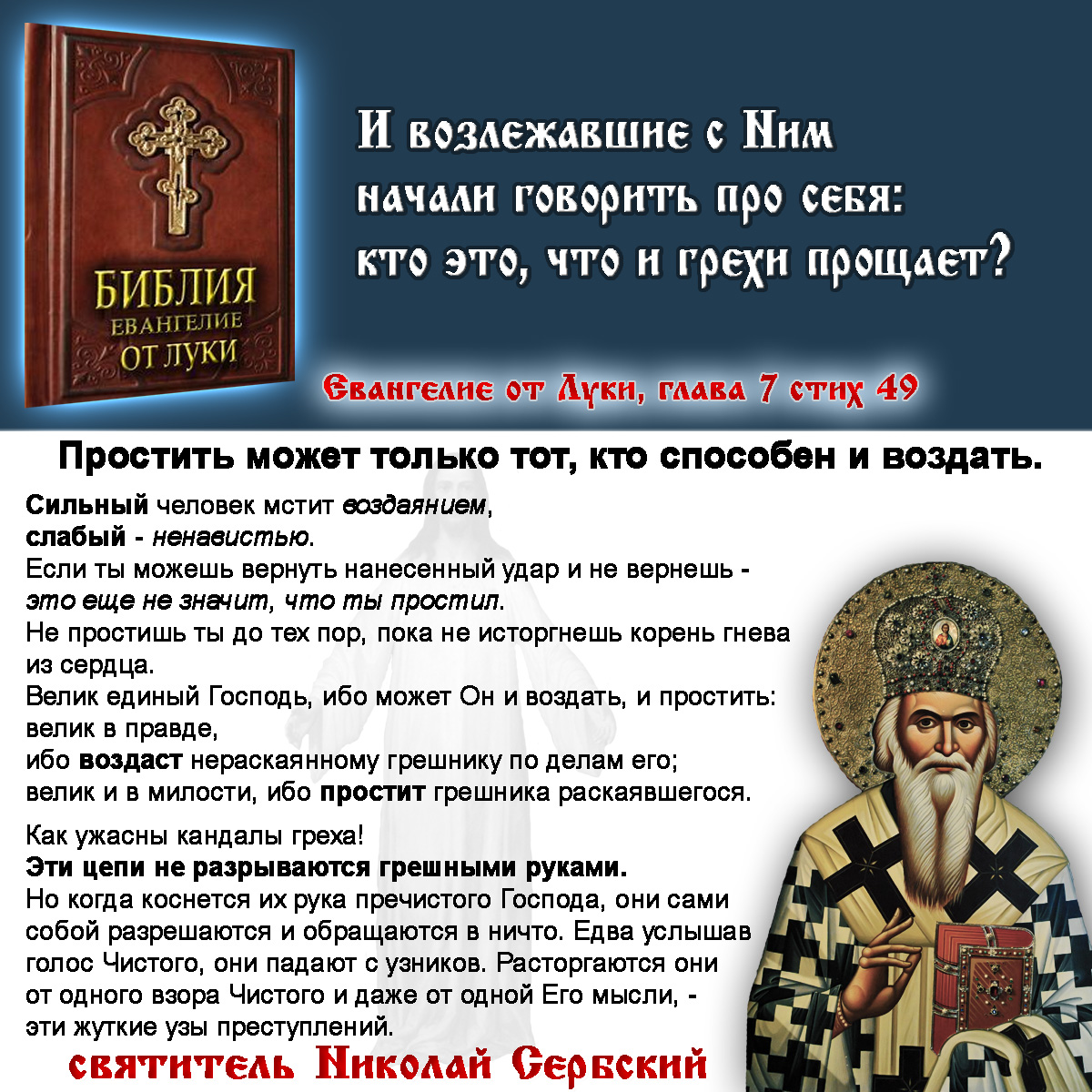 (Мф. 6:14-15) «Ибо если вы будете прощать людям согрешения их, то простит и вам Отец ваш Небесный, а если не будете прощать людям согрешения их, то и Отец ваш не простит вам согрешений ваших».