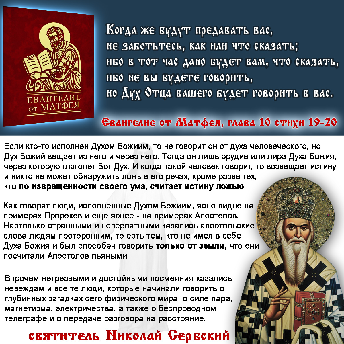 Это слова Того, Кто знает всё и Кто возвестил миру [такие] знания, о которых никто прежде Его пришествия к людям не догадывался. Если кто-то исполнен Духом Божиим, то не говорит он от духа человеческого, но Дух Божий вещает из него и через него. Тогда он лишь орудие или свирель (в серб. букв:, лира. — Пер.) Духа Божия, через которую глаголет Бог Дух. И когда такой человек говорит, то возвещает истину и никто не может обнаружить ложь в его речах, кроме разве тех, кто по извращенности своего ума, считает истину ложью.