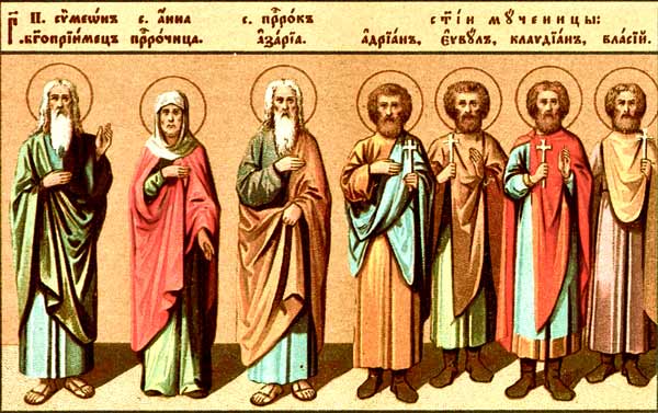 РПЦ в этот день чествует: праведных Симеона Богоприимца и Анну Пророчицу В правление египетского царя Птоломея Филадельфа избран был [и] этот Симеон, как один из знаменитых семидесяти [толковников], которым было вверено дело перевода Библии с еврейского языка на греческий. Симеон добросовестно исполнял свою работу, но, переводя пророка Исайю и дойдя до пророчества: