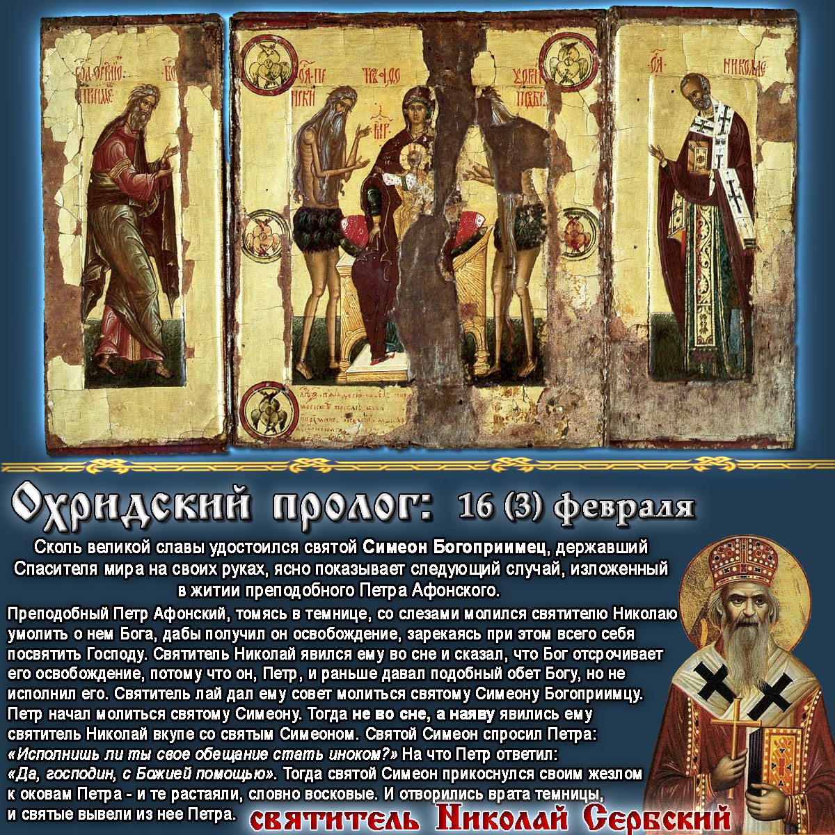 Сколь великой славы удостоился святой Симеон Богоприимец, державший Спасителя мира на своих руках, ясно показывает следующий случай, изложенный в житии преподобного Петра Афонского ([память] 12 июня).