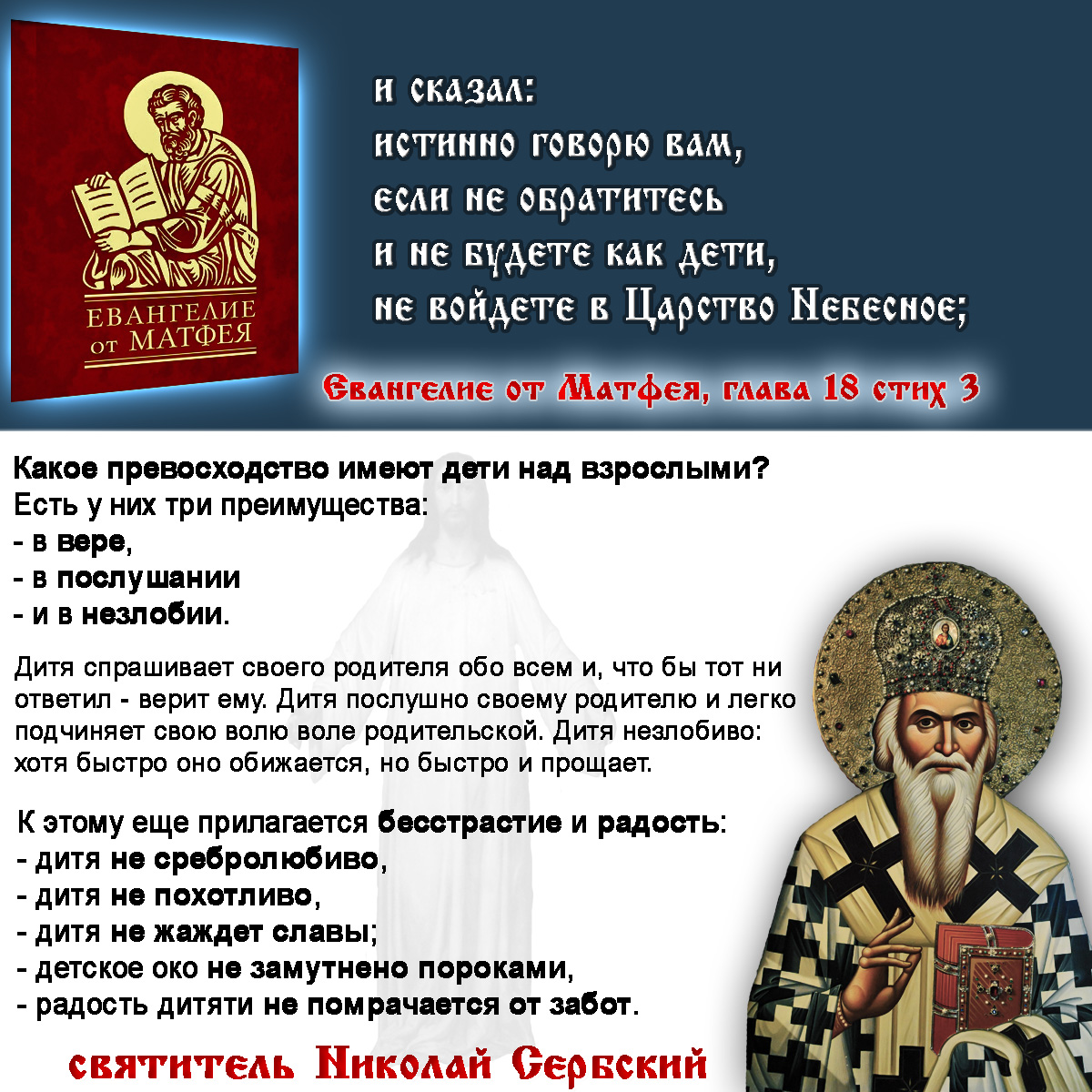 Господь в Евангелии неоднократно призывает каждого человека уподобиться ребенку. Будьте «как дети» (Мф. 18: 3), «ибо таковых есть Царствие Божие» (Мк. 10: 14).