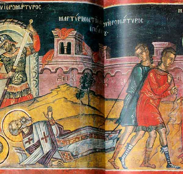Святого Савина избивали тяжелым молотом, а затем подвесили на дереве и жгли тело огнем. В мучениях он предал Господу святую душу.