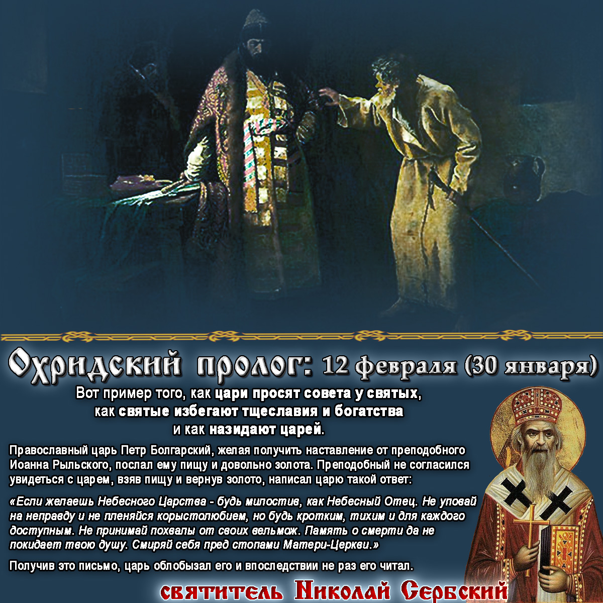 Православный царь Петр Болгарский вместе со своей свитой поехал вдоль Рыльской горы, гонимый неодолимым желанием увидеть преподобного Иоанна Рыльского и получить от него наставление. Впереди себя царь послал гонцов, чтобы те сообщили об этом святому. Но преподобный не согласился увидеться с царем. Опечаленный царь вновь послал людей, вручив им пищи и довольно золота, с просьбой, чтобы святой написал ему какой-нибудь совет. Преподобный Иоанн взял пищу, а золото вернул, не желая к нему даже прикасаться. И написал царю такой ответ: