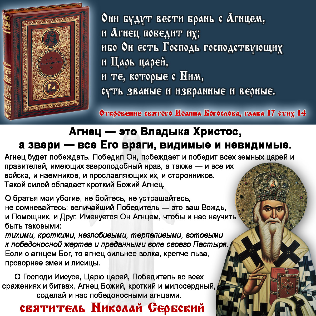 "Они будут вести брань с Агнцем, и Агнец победит их; ибо Он есть Господь господствующих и Царь царей, и те, которые с Ним, суть званые и избранные и верные."