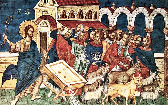Изгнание торгующих из храма (Ин. 2:16); XIV в.; Сербия, Косово, монастырь Высокие Дечаны, алтарь