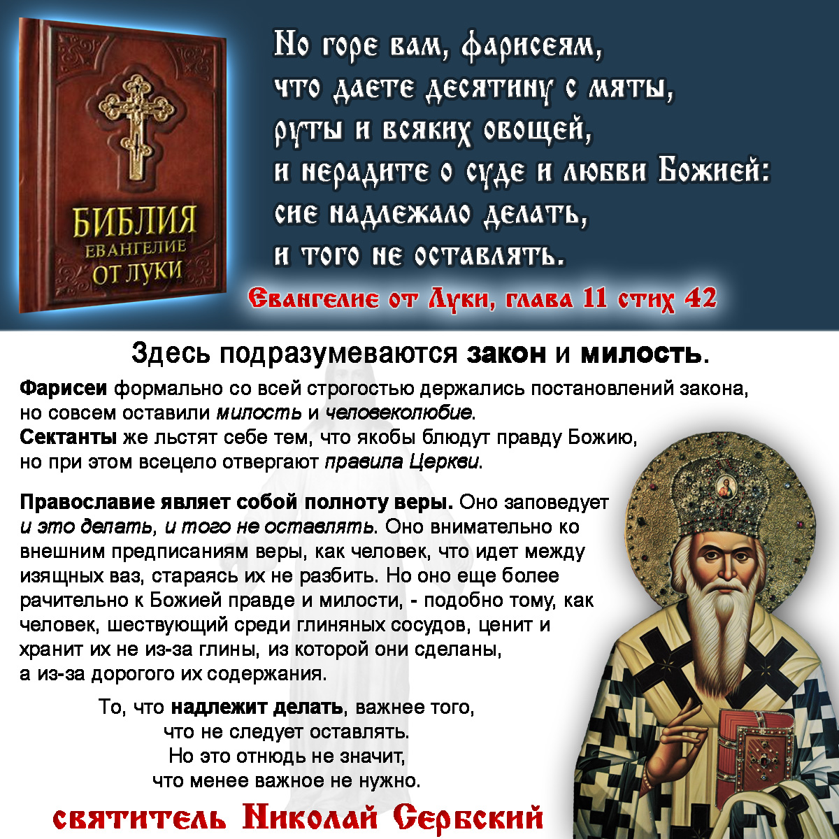 "Но горе вам, фарисеям, что даете десятину с мяты, руты и всяких овощей, и нерадите о суде и любви Божией: сие надлежало делать, и того не оставлять."