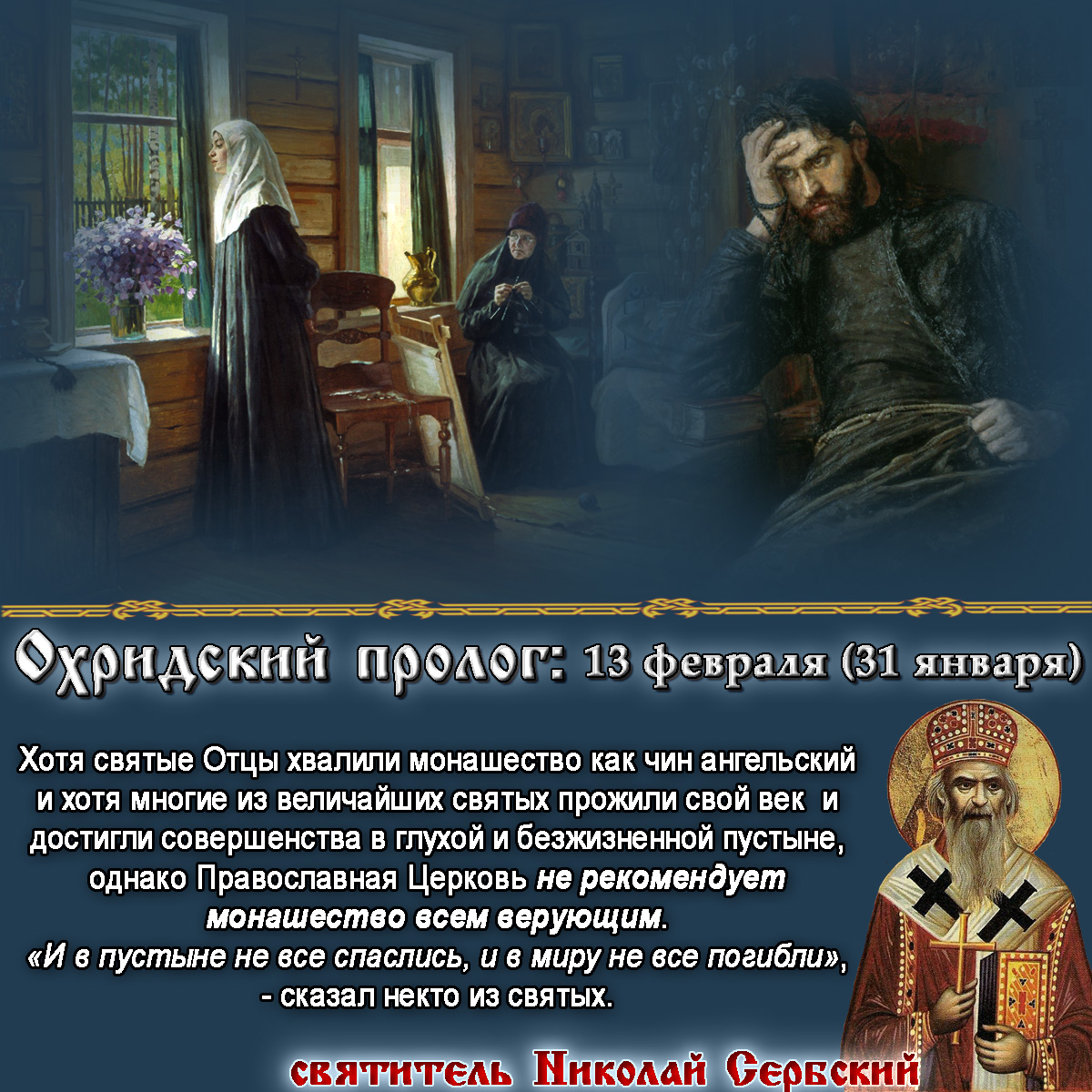 Хотя святые Отцы хвалили монашество как чин ангельский и хотя многие из величайших святых прожили свой век и достигли совершенства в глухой и безжизненной пустыне, однако Православная Церковь не рекомендует монашество всем верующим.