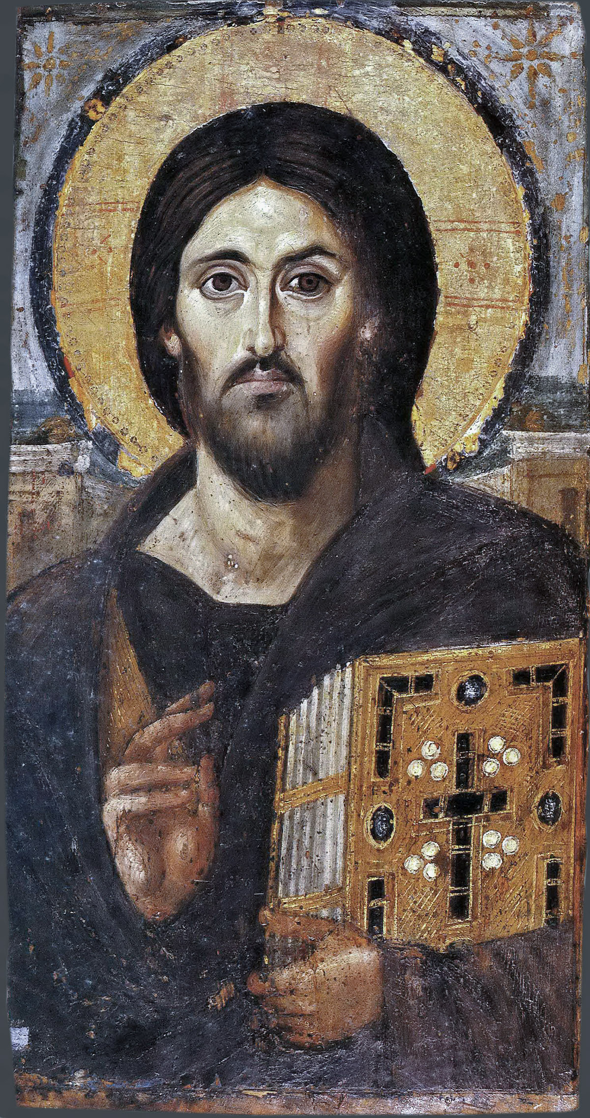 Христос Пантократор; первая половина VI в.; монастырь св. Екатерины, Синай, Египет; материал: дерево, золото (сусальное), пигменты натуральные; техника: золочение, энкаустика; 45.5 x 84 см
