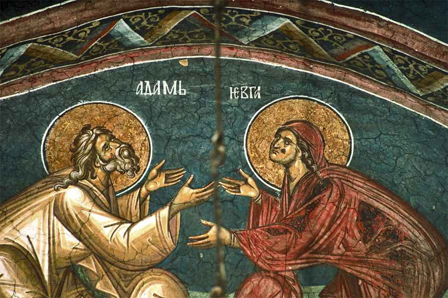 "Адам и Ева преподающие к престолу"; 14-й век; фрагмент фрески "Страшный суд. Этимасия с предстоящими"; Сербия, Косово, монастырь Высокие Дечаны, неф, свод