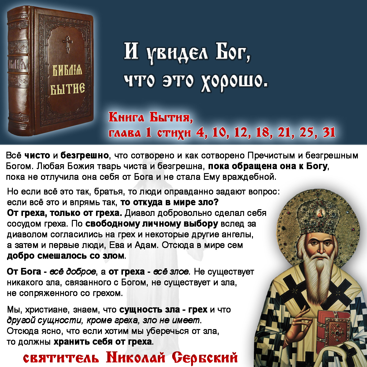 О братья мои, от Бога — всё доброе, а от греха — всё злое. Не существует никакого зла, связанного с Богом, а равно [не существует] и зла, не сопряженного со грехом. Многие философы, исследуя сущность зла, по грубости своего ума утверждали, что зло — в материи, что материя — это зло. Между тем только мы, христиане, знаем, что сущность зла — грех и что другой сущности, кроме греха, зло не имеет. Отсюда ясно, что если хотим мы уберечься от зла, то должны хранить себя от греха.