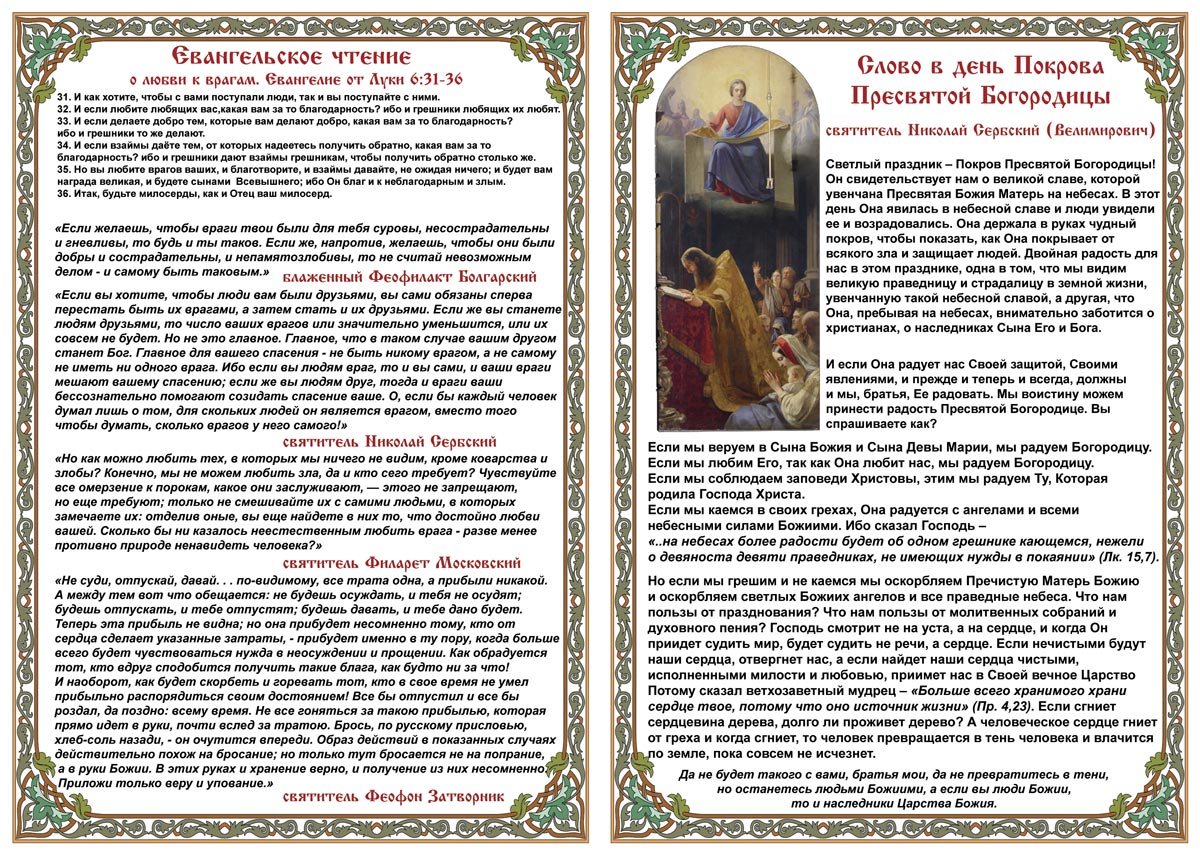 скачать в высоком разрешении, формат jpgК празднику Покрова Пресвятой Владычицы нашей Богородицы и Приснодевы Марии мы подготовили для вас листовку: ее можно распечатать на стандартном листе формата А4 и сложить пополам: получится удобная 4-х страничная брошюра с одним сгибом. Советуем предварительно ознакомиться с ее содержанием и взять с собой на праздничную службу: знание текста евангельского чтения поможет вам стать соучастником общественного богослужения.