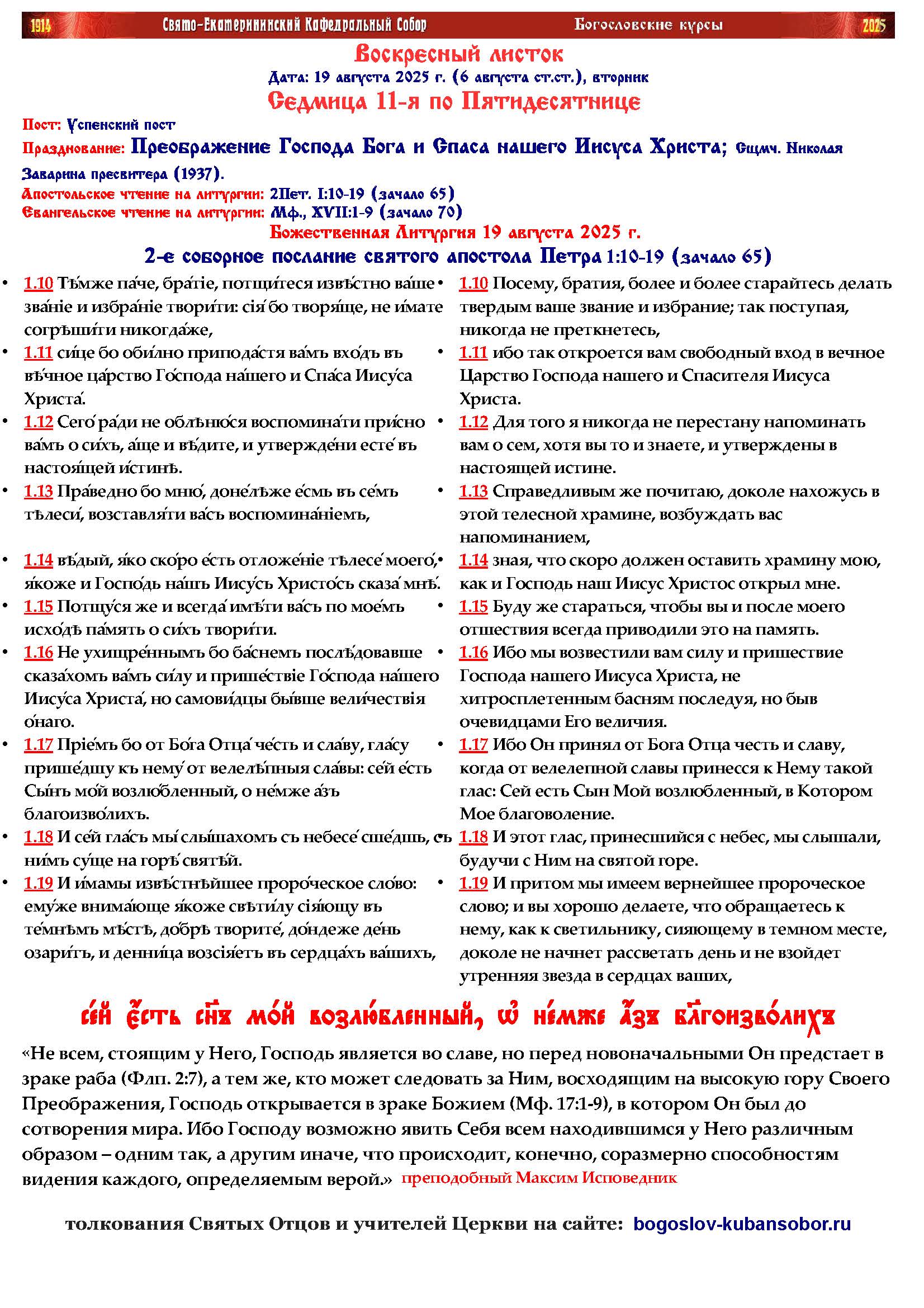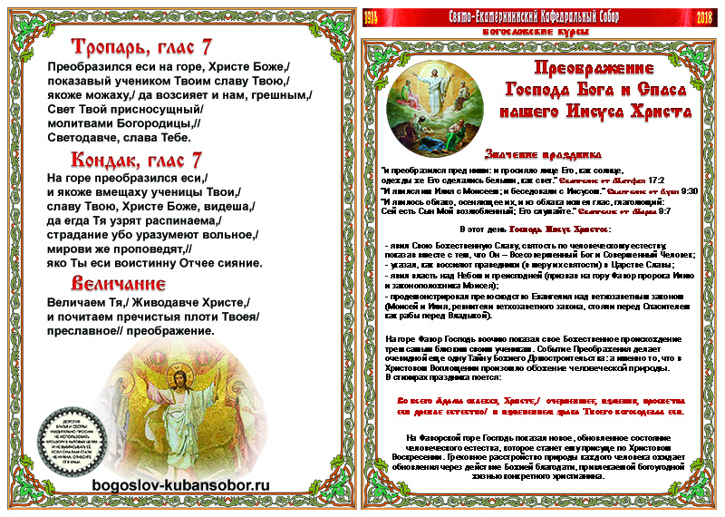 скачать в высоком разрешении, формат jpgК празднику Преображения Господа Бога и Спаса нашего Иисуса Христа мы подготовили для вас листовку: ее можно распечатать на стандартном листе формата А4 и сложить пополам: получится удобная 4-х страничная брошюра с одним сгибом. Советуем предварительно ознакомиться с ее содержанием и взять с собой на праздничную службу: знание текстов апостольского и евангельского чтения поможет вам стать соучастником общественного богослужения.