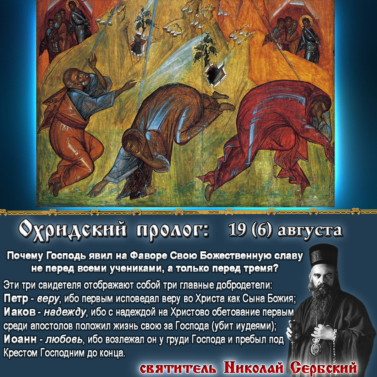 На третий год Своей проповеди на земле Господь Иисус Христос всё чаще говорил Своим ученикам о Своих близких страданиях, а вместе с тем — и о славе Своей после страданий на кресте. Дабы Его предлежащие страдания совсем не обескуражили Его учеников и дабы не отпали они от Него, Он, Премудрый, захотел прежде Своих страданий явить им отчасти Свою Божественную славу. Посему, взяв с Собой Петра, Иакова и Иоанна, взошел он с ними ночью на гору Фавор и преобразился там перед ними.