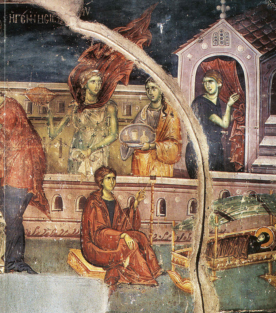 Рождество Богородицы; Византия; XIV в.; мастер: Мануил Панселин; местонахождение: Греция, Афон, Карея, Протат, церковь Успения Богородицы