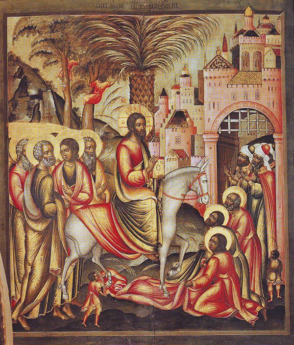Народ постилал одежды свои под ноги осла, на котором Он ехал, дети восклицали, вознося хвалу Богу.